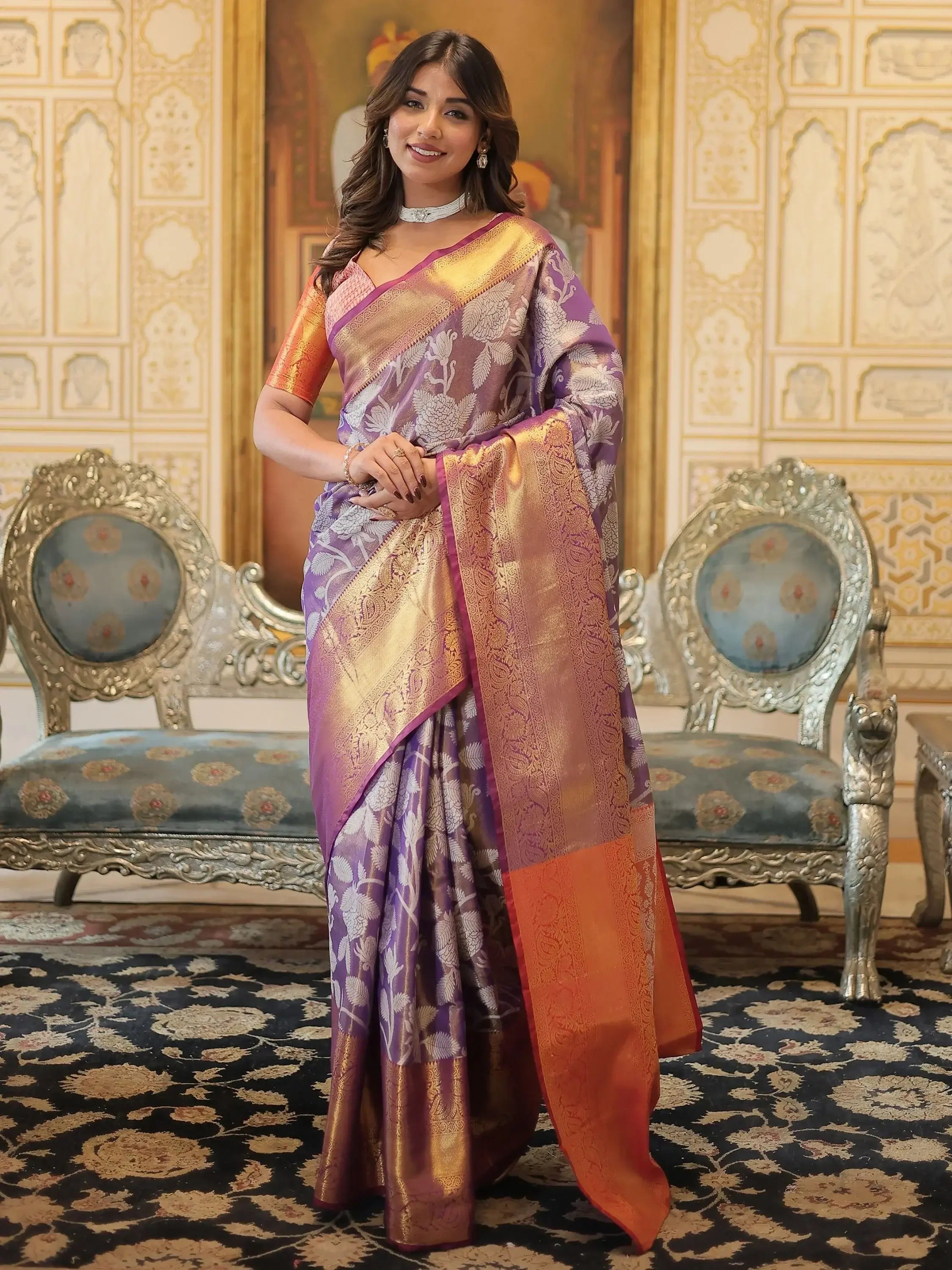 Add a touch of elegance and charm to your wardrobe with our attractive purple zari weaving kanjivaram silk saree. This stunning saree features a beautiful purple color with intricate printed and zari weaving work, making it the perfect choice for festivals, weddings, and other special occasions. The saree comes with a coral-red color silk material blouse that complements the saree beautifully.