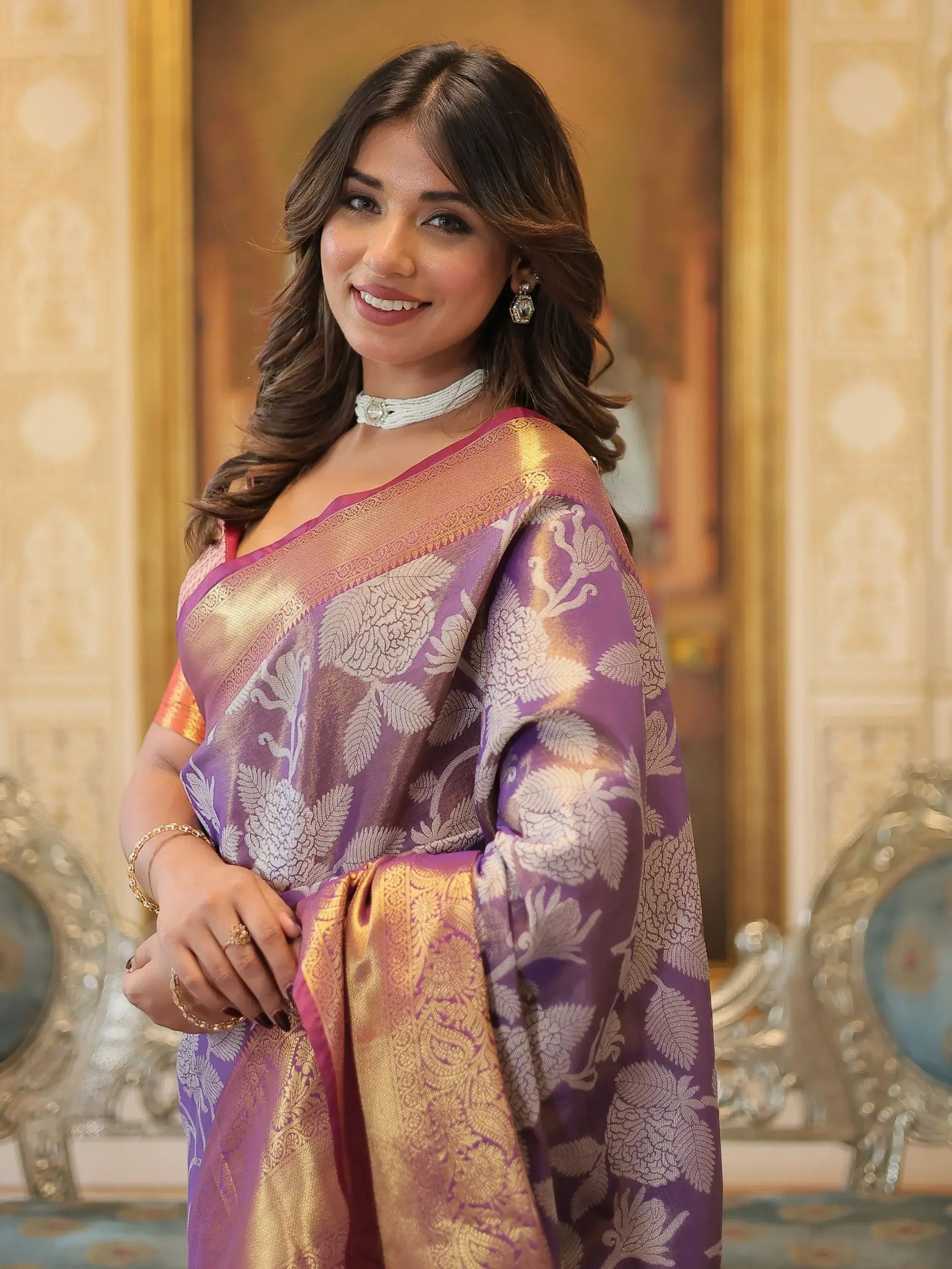 This saree includes its vibrant purple color, printed and zari weaving work, and traditional Kanjivaram silk fabric. The detailed craftsmanship and attention to detail make this saree a standout piece in any collection. Whether you're attending a wedding, festival, or special event, this saree will make you feel confident and stylish.