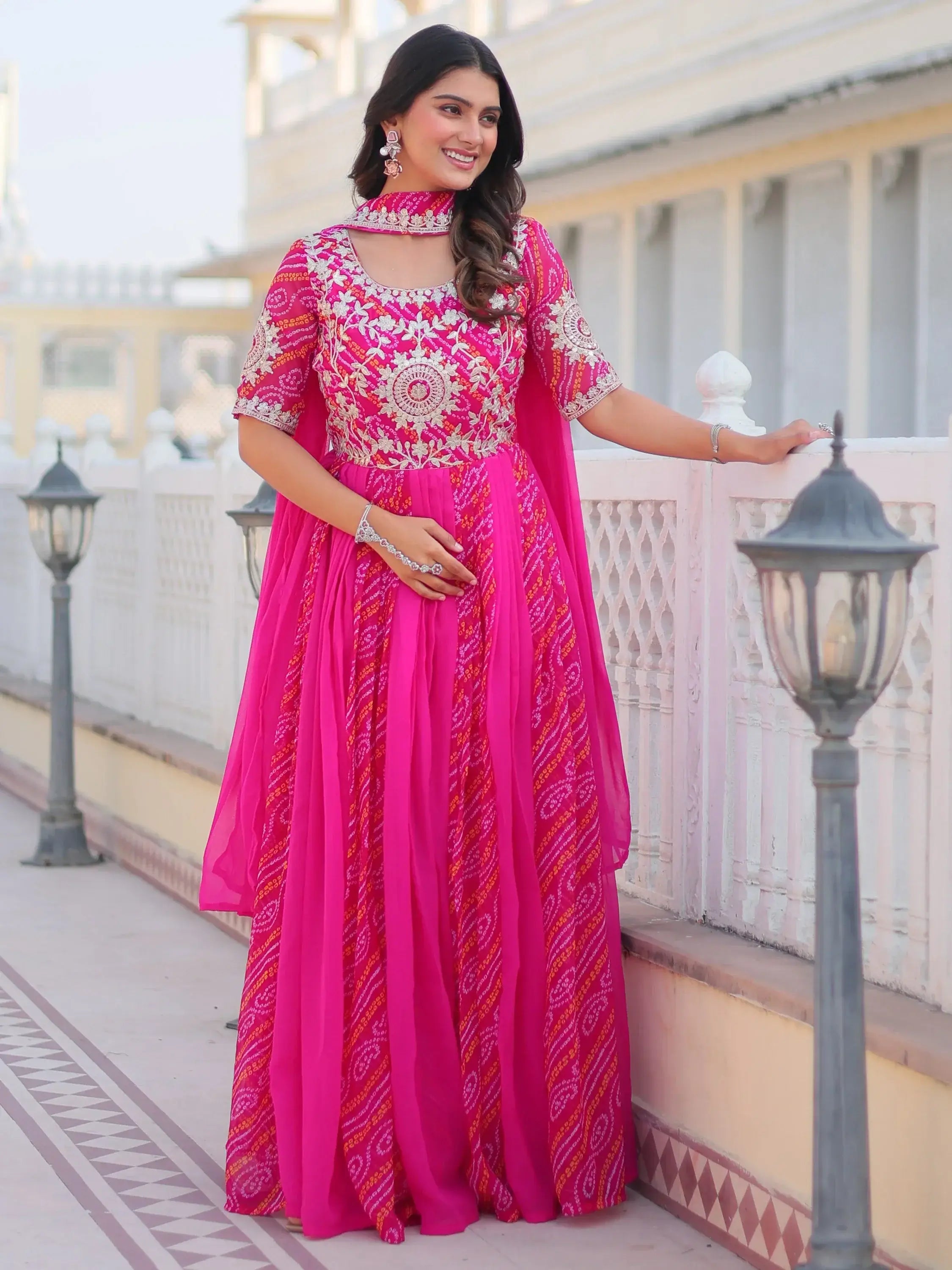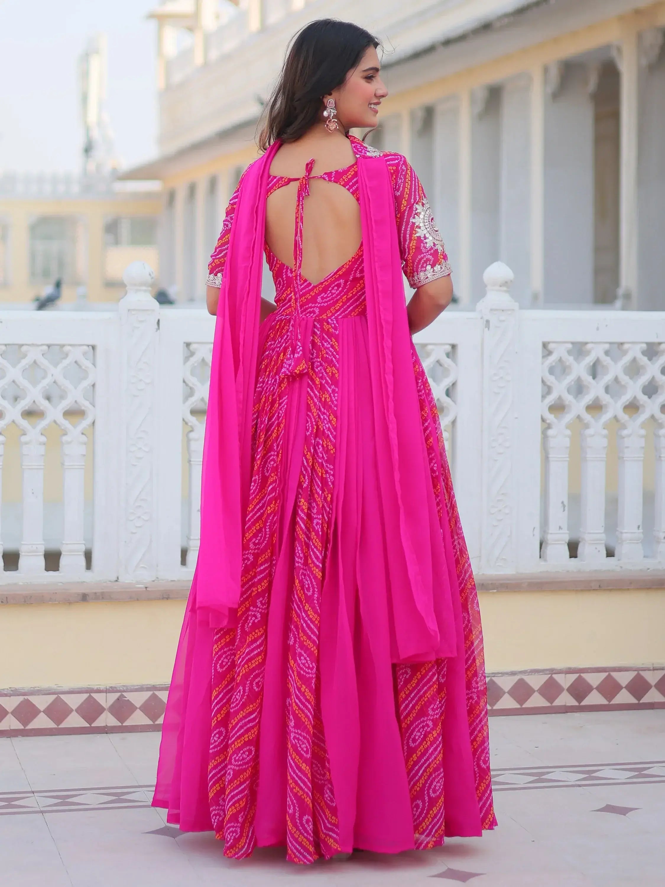 Introducing our stunning rani pink color georgette gown with exquisite bandhani print work, thread embroidery, and sequin detailing. This elegant gown is perfect for all your special occasions, whether it's a festival, function, or event. The vibrant pink color will surely make you stand out from the crowd, and the intricate detailing adds a touch of sophistication to your look.