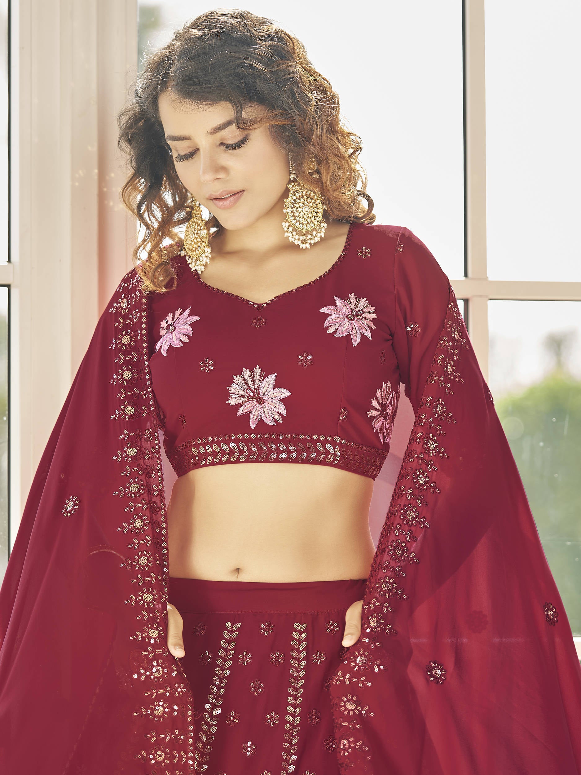 Reign in classic charm and grandeur with this attractive red color georgette material flair lehenga embellished with thread, multi sequins, and embroidered work which makes it appear more adorning.