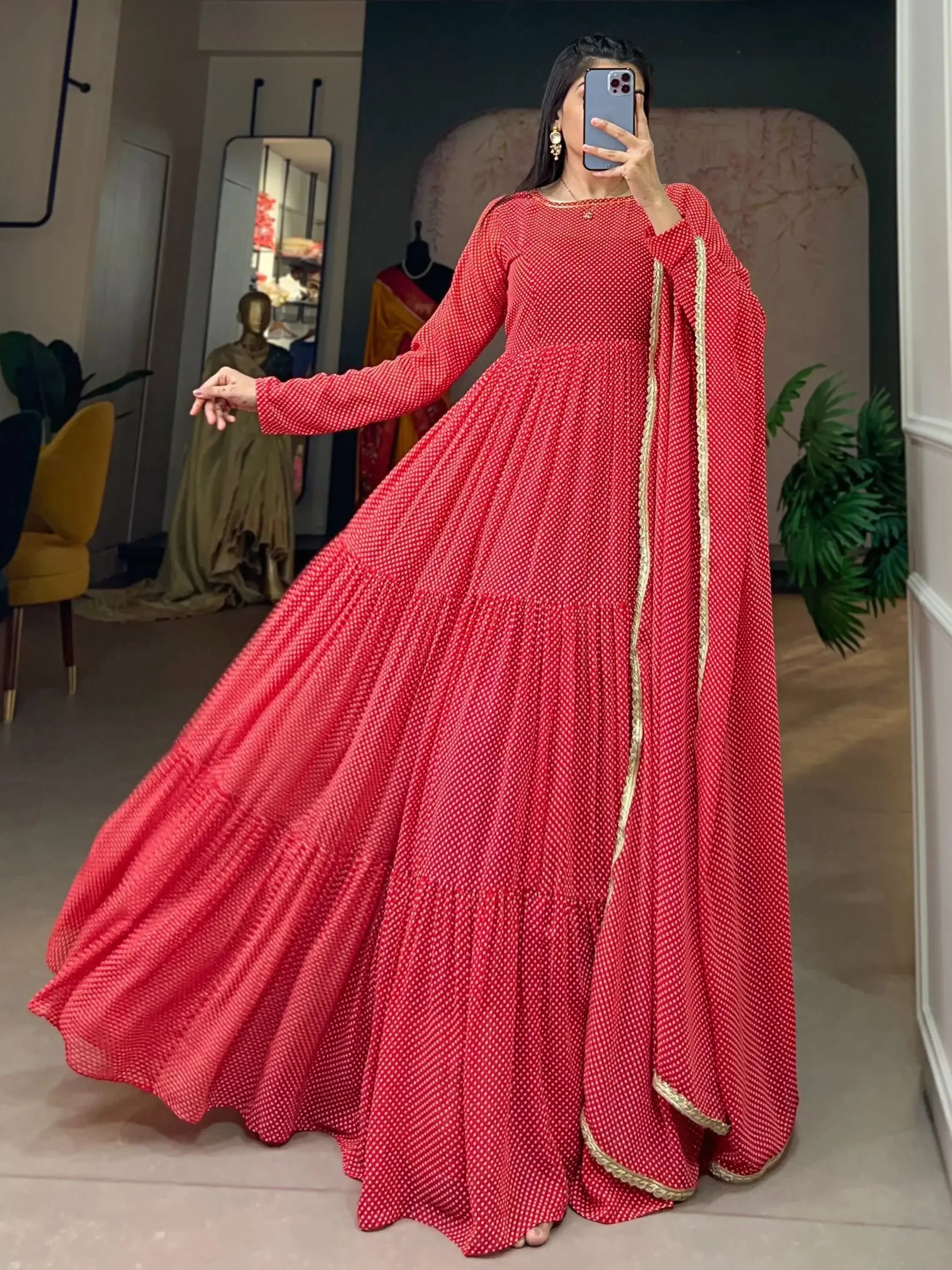 The versatility of this red georgette gown allows you to style it in various ways to suit different occasions. Drape the dupatta elegantly over your shoulder for a traditional look, or wrap it around your arms for a modern twist. The gown's flair and length provide ample opportunity to showcase your personal style while keeping you in the spotlight.