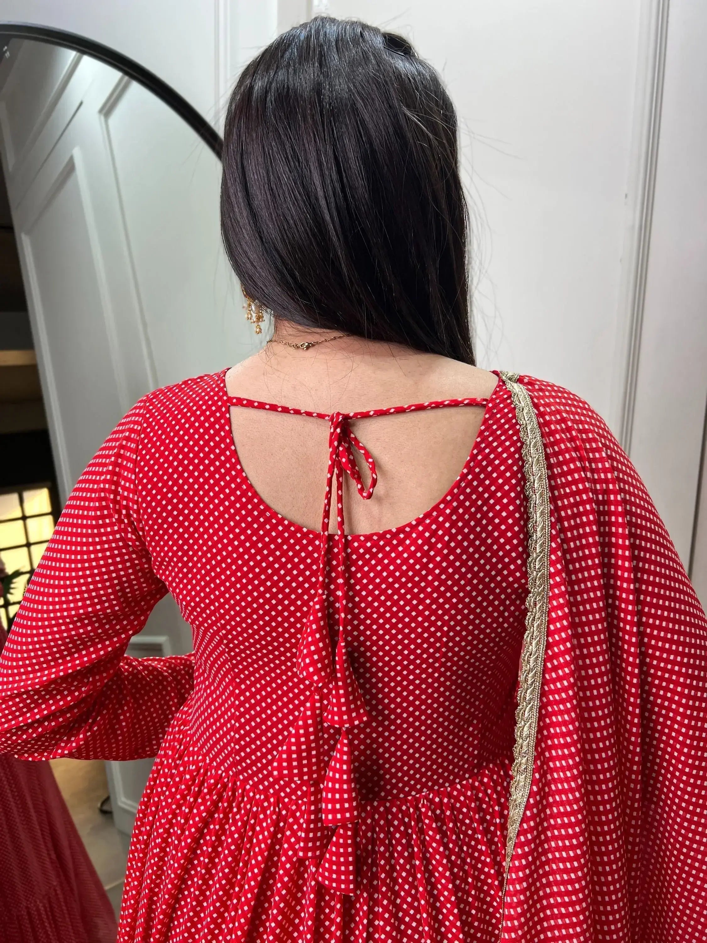 Complementing the gown is a matching red georgette dupatta, adorned with beautiful print work and delicate sequin lace detailing. The 2.3-meter length of the dupatta allows for versatile draping styles, adding a layer of charm and elegance to your ensemble. The combination of the gown and dupatta creates a cohesive and captivating look, perfect for making a statement at any event.