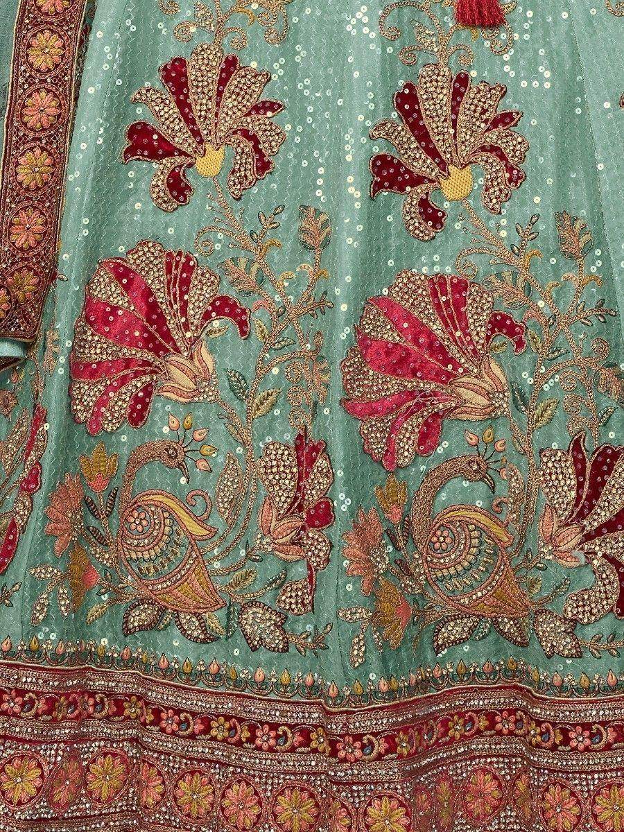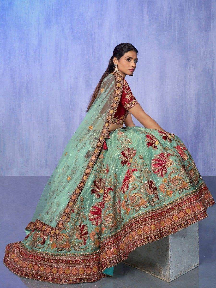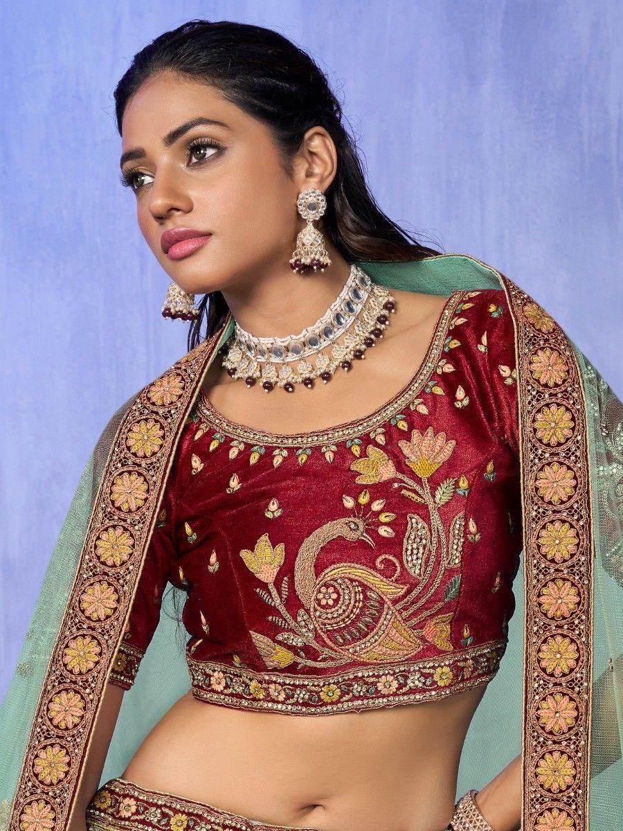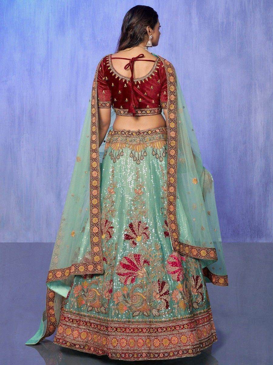 Not only does this lehenga offer exceptional craftsmanship and design, but it also comes with several benefits. When you wear this attractive velvet material bridal lehenga, you are sure to receive countless compliments for your rich sense of style. The combination of the turquoise color, velvet fabric, and intricate embellishments creates a breathtaking look that will make you stand out as a beautiful bride.