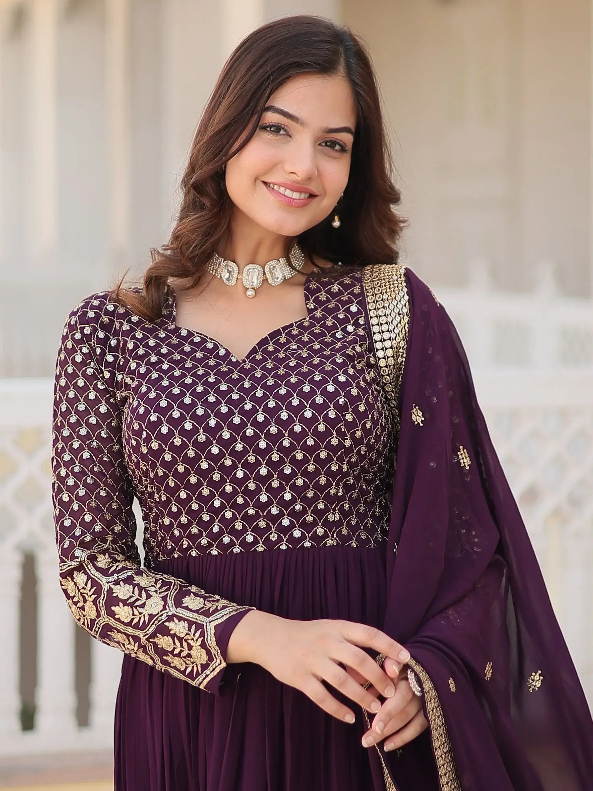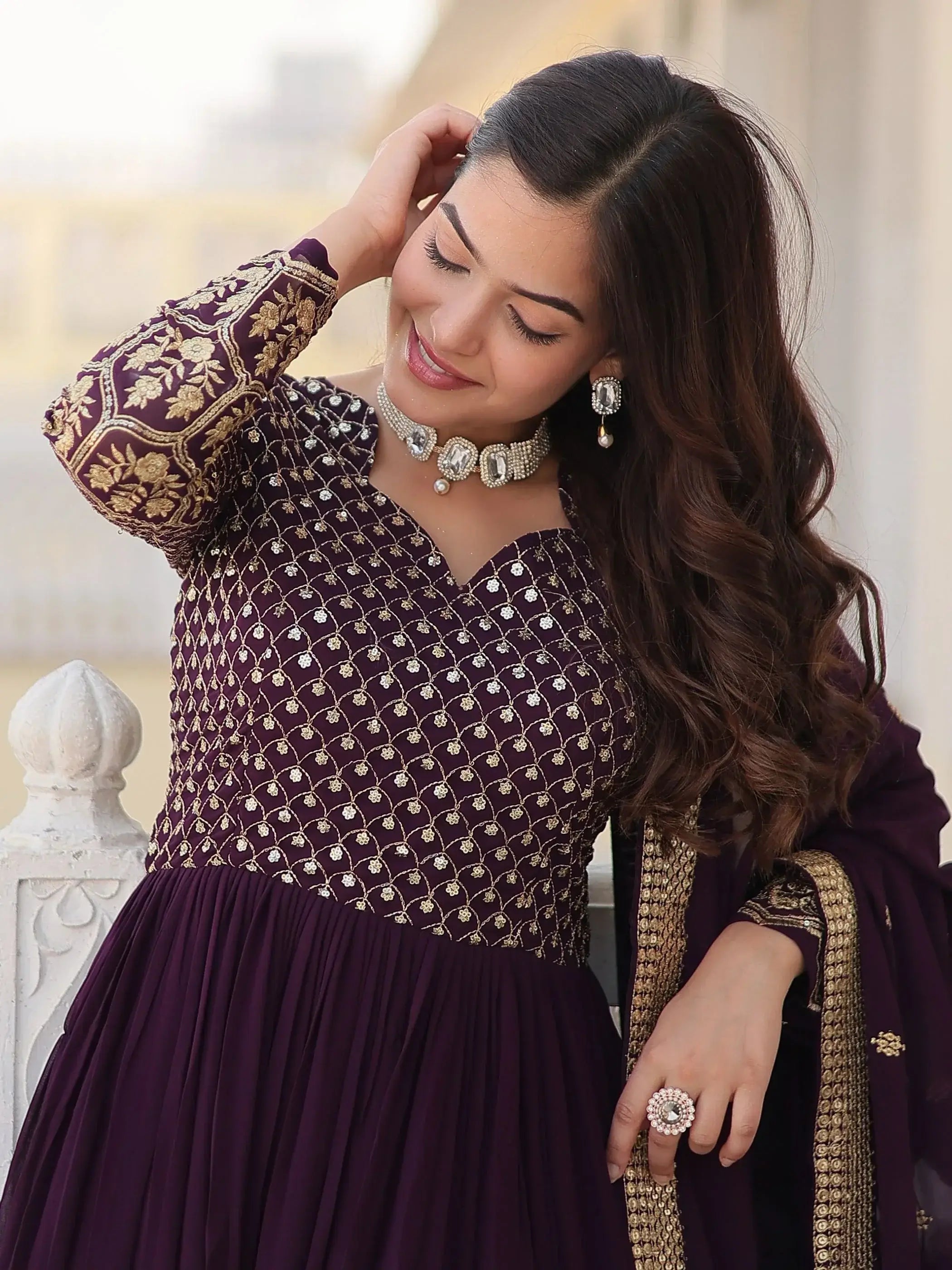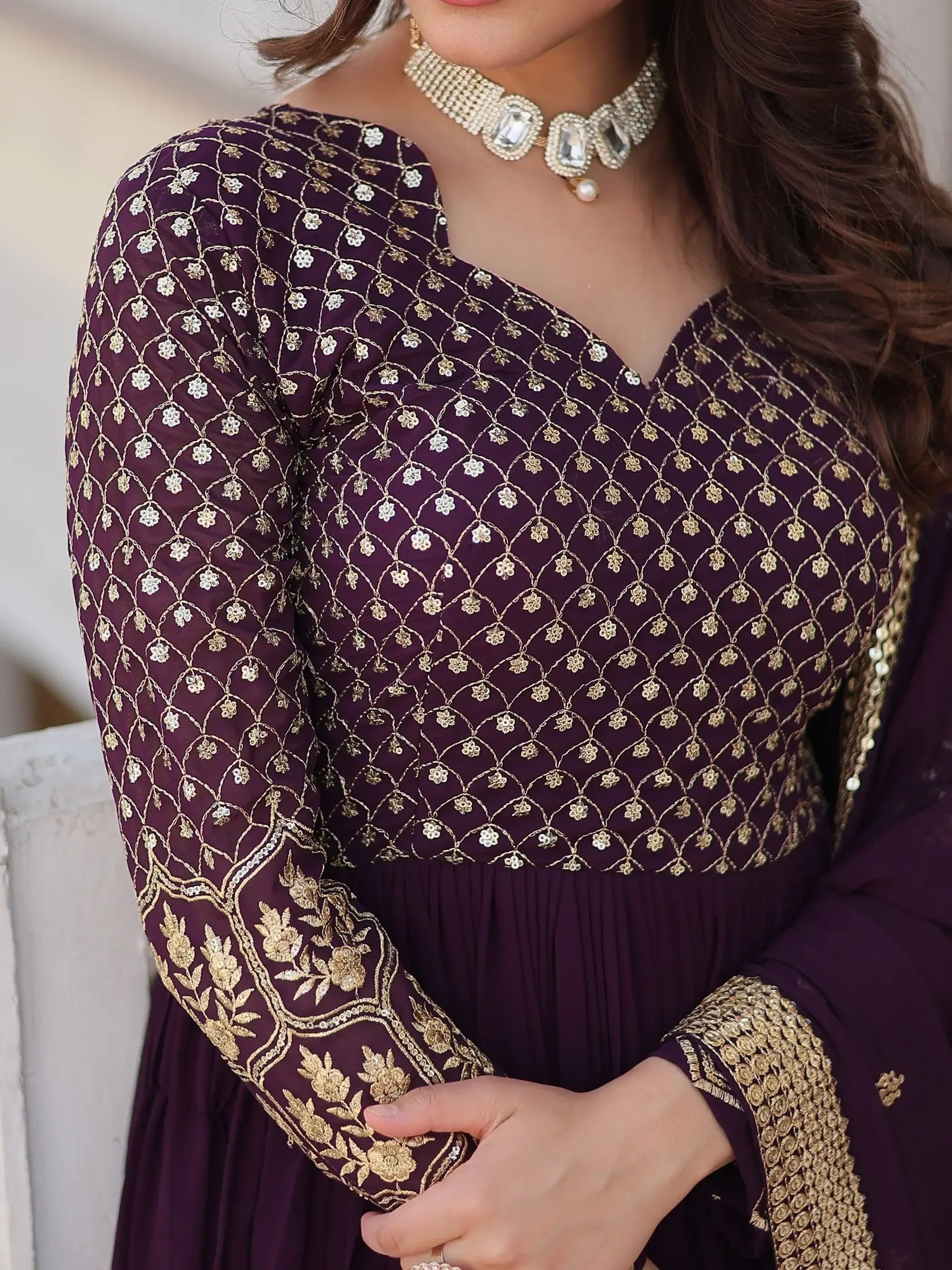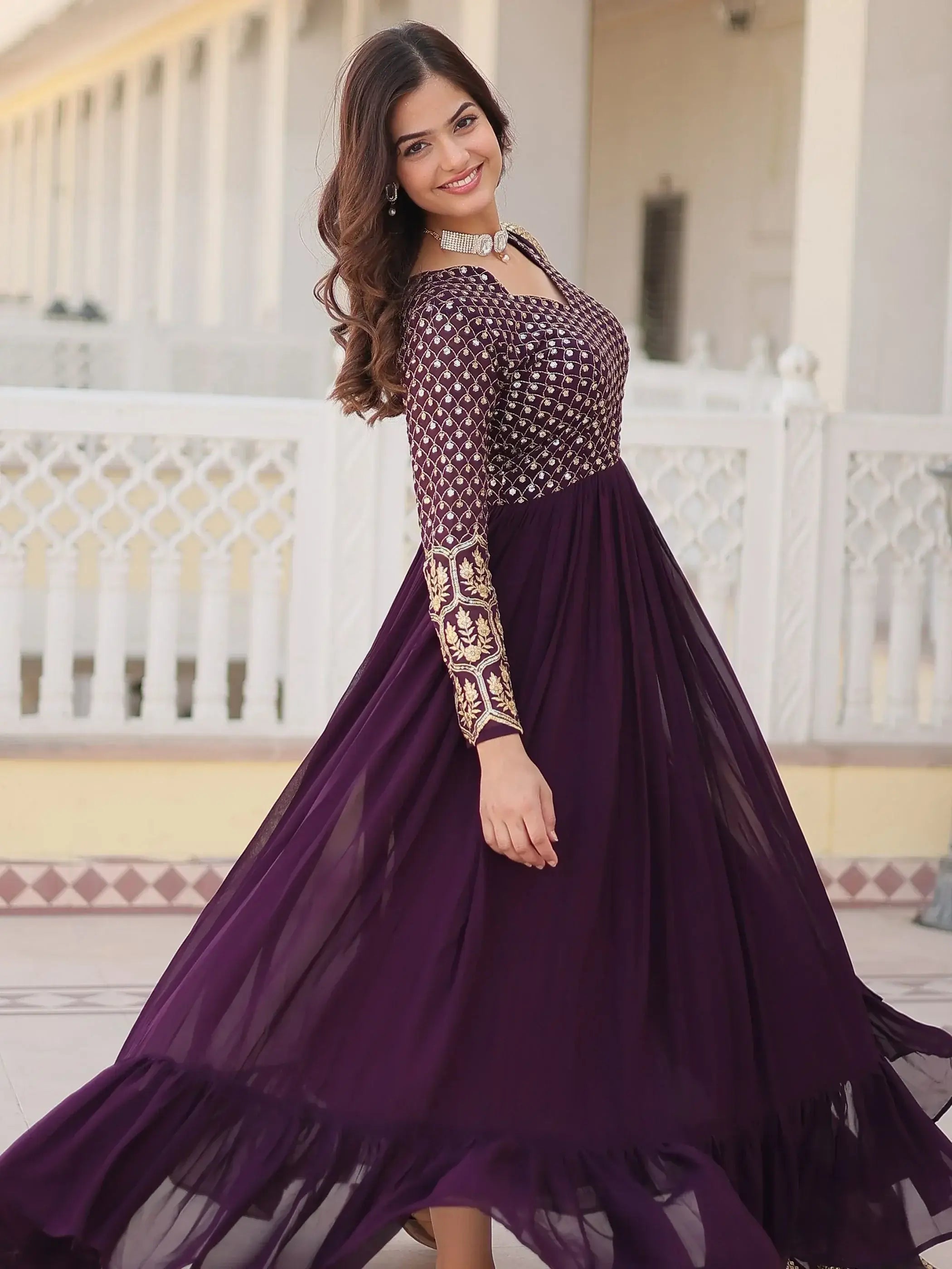 Our wine georgette gown with zari, thread embroidery, and sequin work is a quintessential piece for those who seek elegance and sophistication. This fully stitched designer gown is available in sizes ranging from XS to XXL, ensuring a perfect fit for every silhouette.