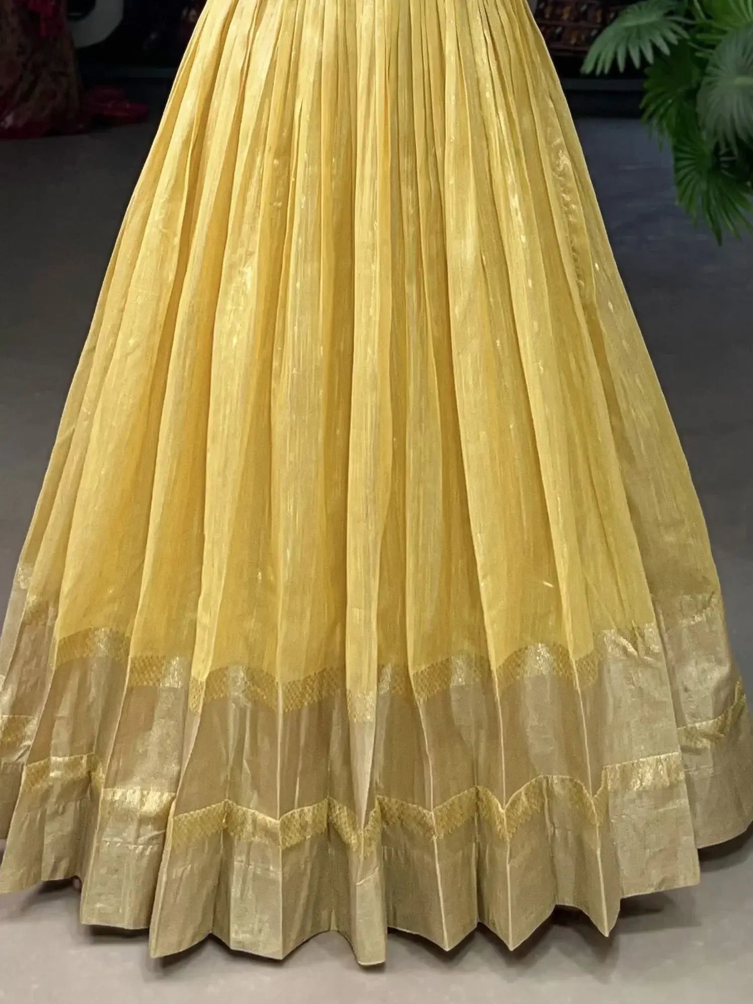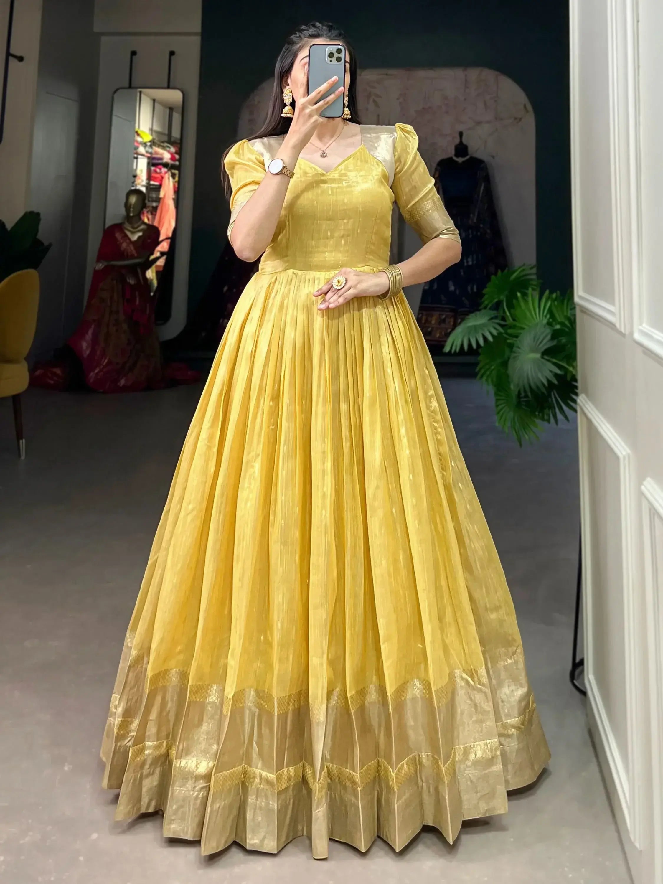 Illuminate the room with our radiant yellow color organza material gown, adorned with exquisite zari weaving work. This captivating gown is fully stitched and available in sizes ranging from XS to L, ensuring a perfect fit for every body type. With a voluminous 3.50-meter flair and a graceful length of 56 inches, this gown exudes elegance and charm, making it an ideal choice for any festive occasion.