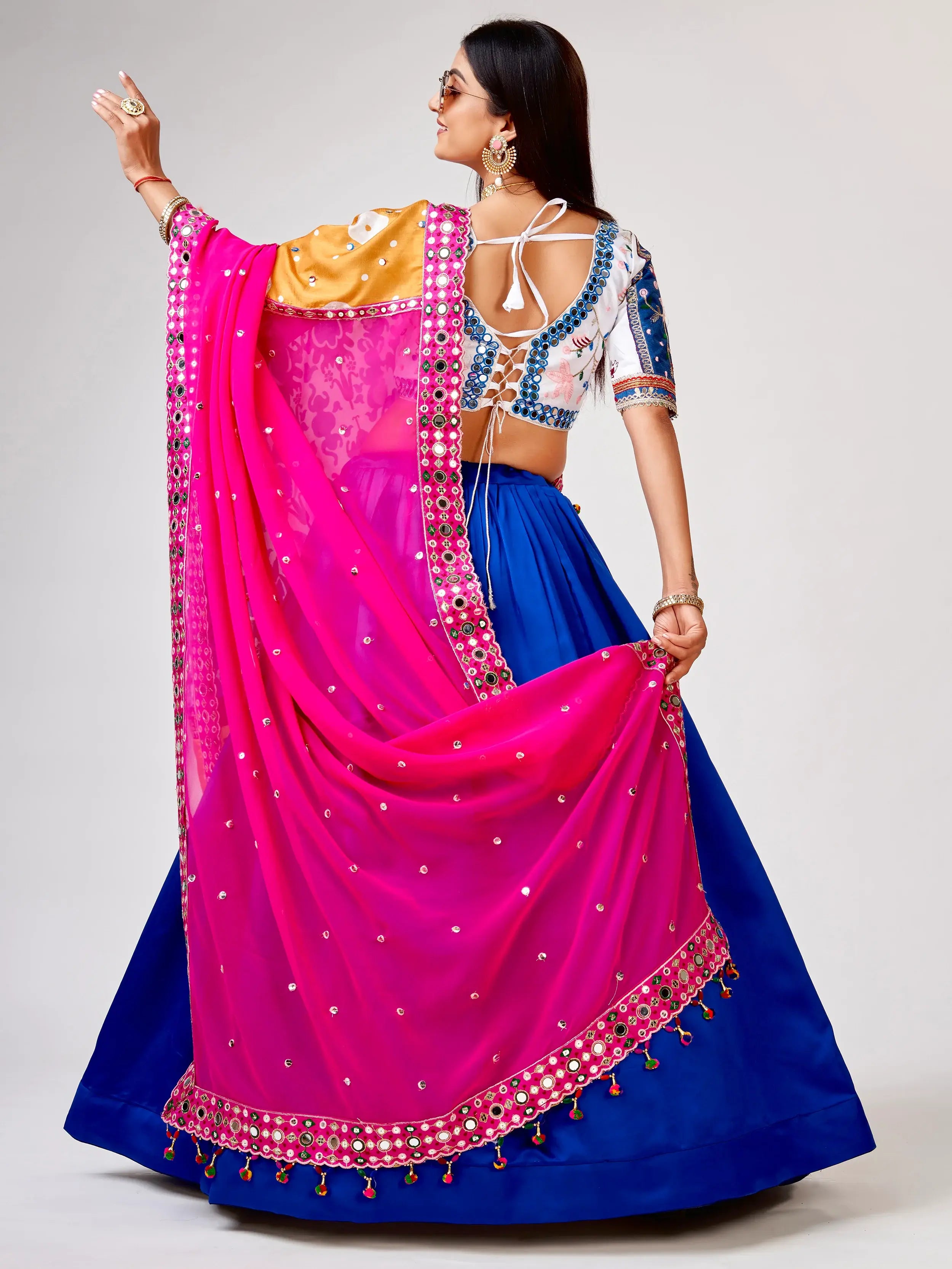 Introducing our stunning blue mirror work silk navratri wear lehenga choli with dupatta, the perfect outfit for your festive occasions! Crafted with exquisite detail and featuring a beautiful blue Korean silk material, this lehenga choli set is truly a masterpiece.
