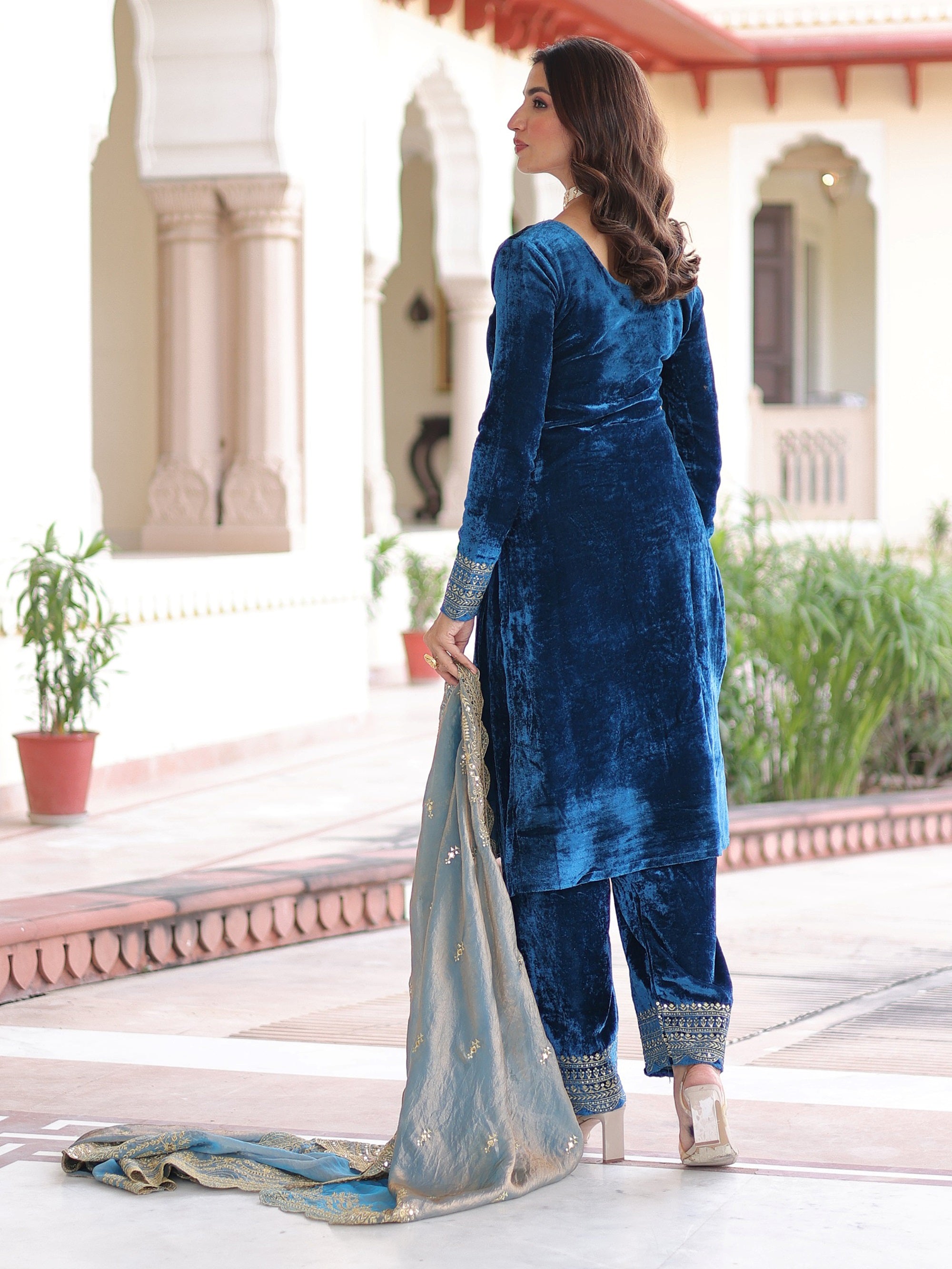 This luxurious velvet ethnic suit set showcases a rich, royal blue tone adorned with heavy sequins and zari embroidered work, giving it a premium, festive, and wedding-wear appeal. The top is crafted in soft velvet with a round neckline, full sleeves, cotton lining, and standard stitched finishing for elegant comfort.