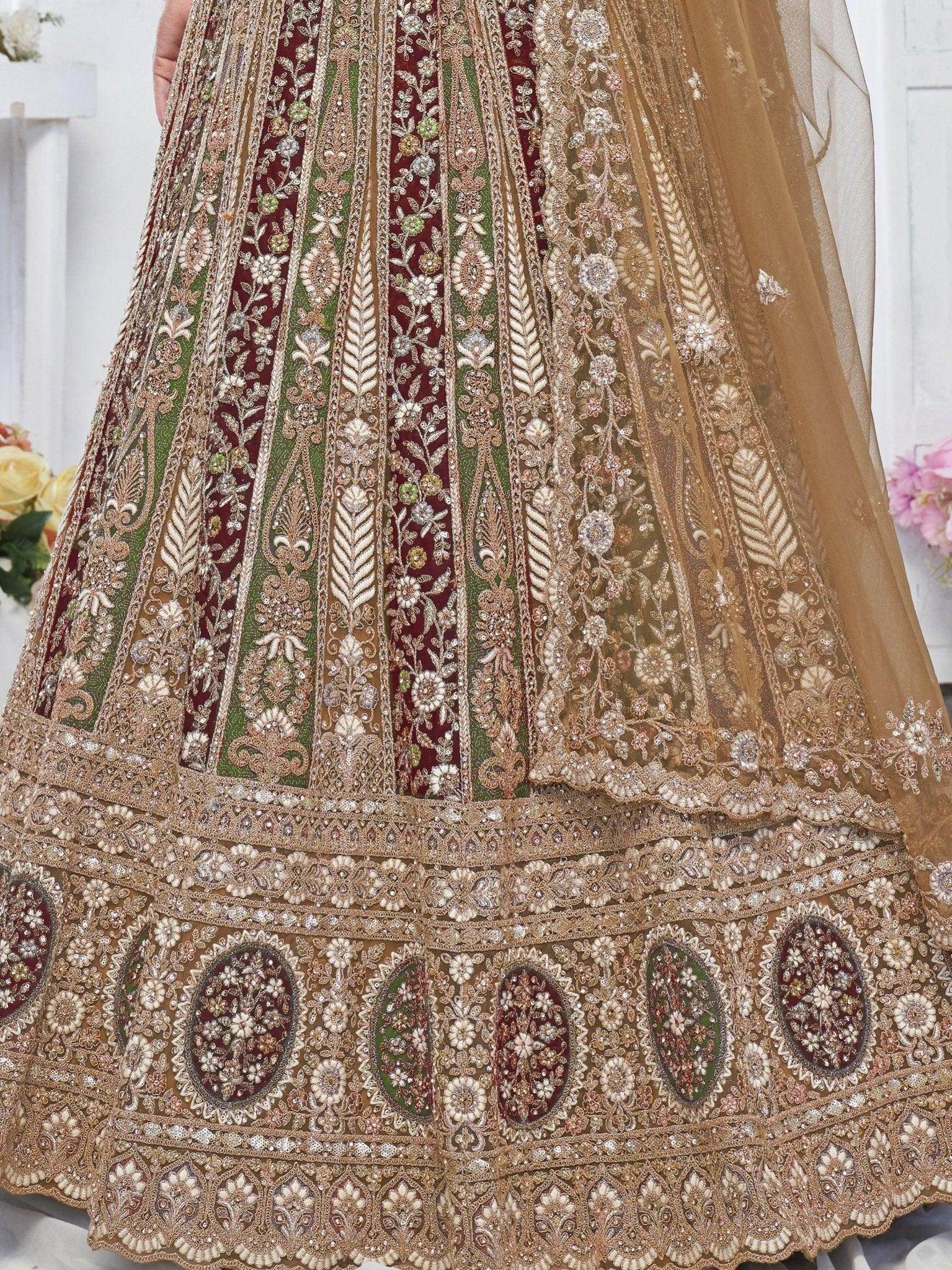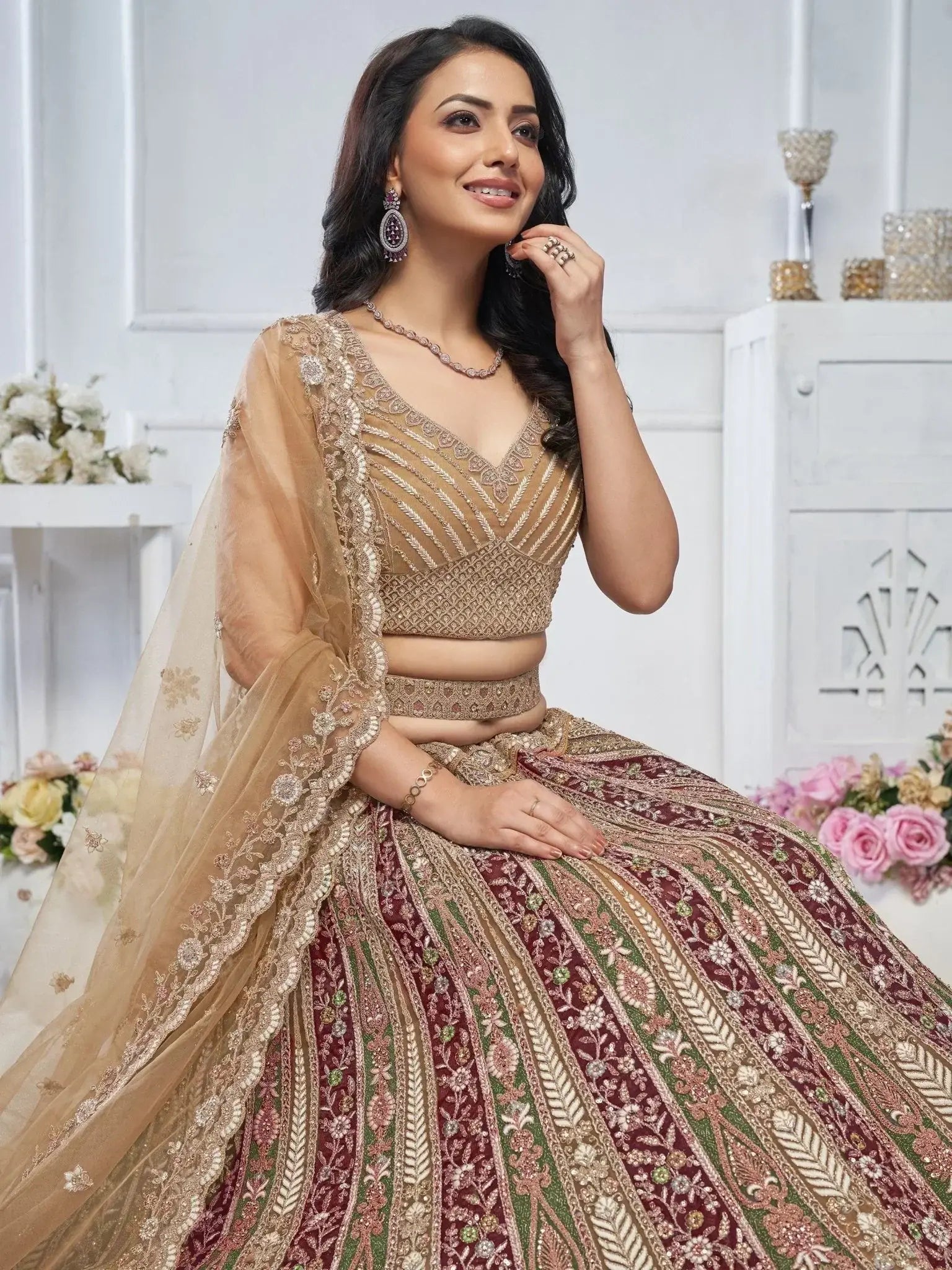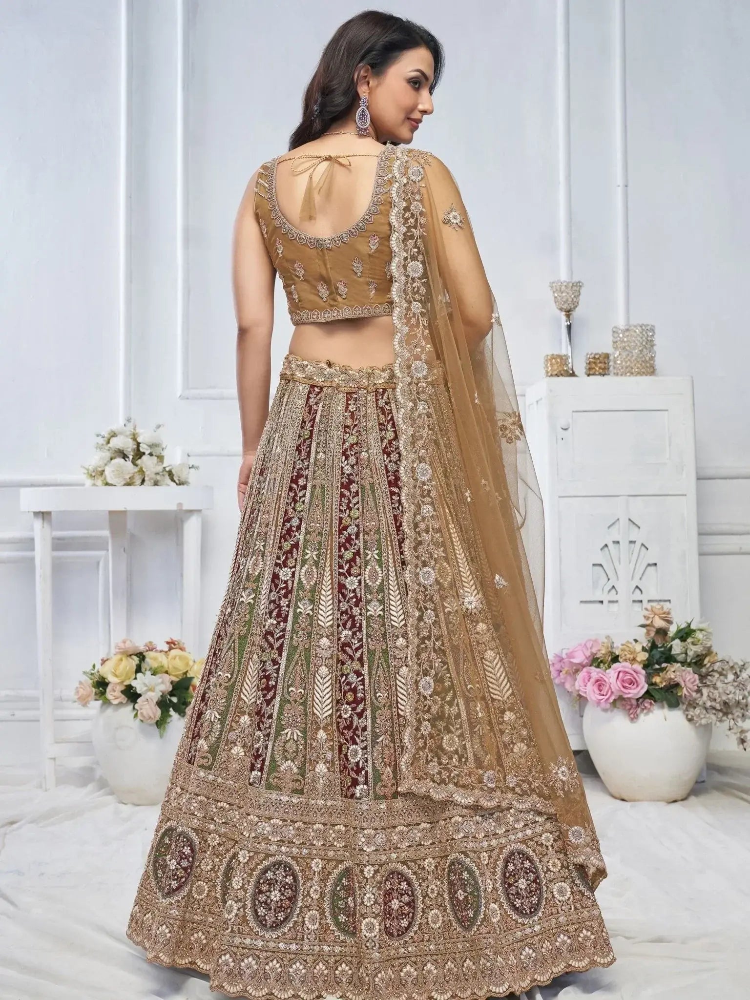 This beautiful ensemble features a brown color net lehenga with intricate zari weaving work, sequin work, and embroidered detailing. The similar color net blouse is adorned with sequin work and embroidered accents, while the matching net dupatta showcases sequins, thread embroidery, and a beautiful lace border.