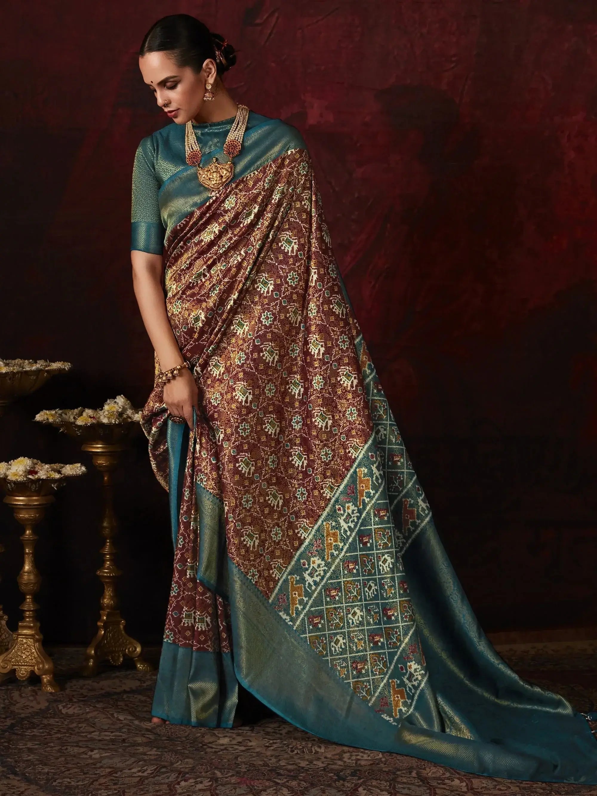 Introducing a timeless symbol of sophistication - the exquisite brown silk saree adorned with intricate Patola print work and delicate zari weaving. This captivating ensemble effortlessly blends traditional craftsmanship with contemporary allure, making it an ideal choice for weddings, festivals, and other special occasions. The rich brown hue exudes warmth and elegance, while the intricate Patola print and zari weaving add a touch of opulence and charm.