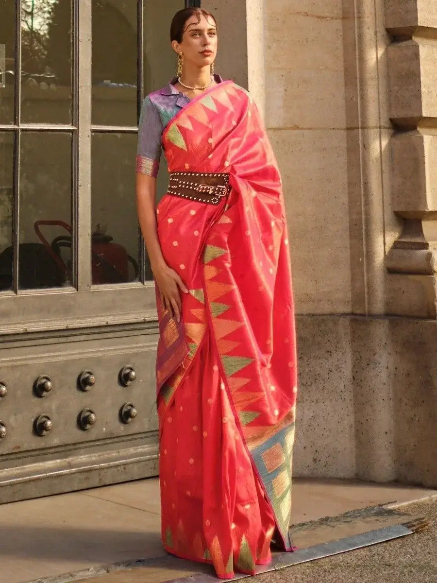 Create a mesmerizing look for your wedding functions by draping this fabulous coral-red silk saree. Pair it with stunning accessories and watch as you effortlessly steal the spotlight. This saree is a true style statement that celebrates tradition and elegance.