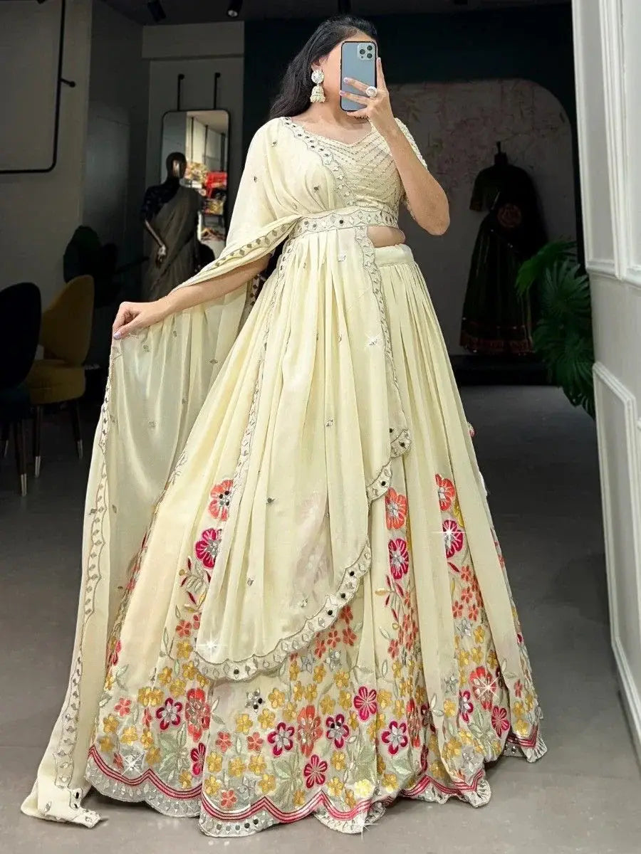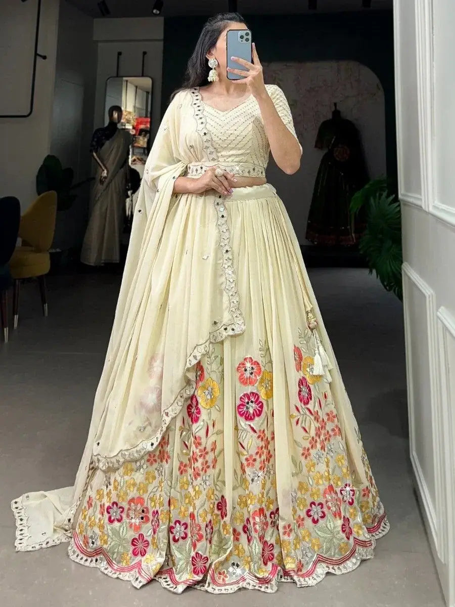 The cream-colored lehenga is not only visually stunning but also comfortable to wear. It is stitched up to 42 inches and boasts 3.50 meters of flair, creating a graceful and flowing silhouette. The choli comes with unstitched material, allowing for customization based on individual preferences and sizes. The dupatta is 2.50 meters long, providing versatility in draping styles.