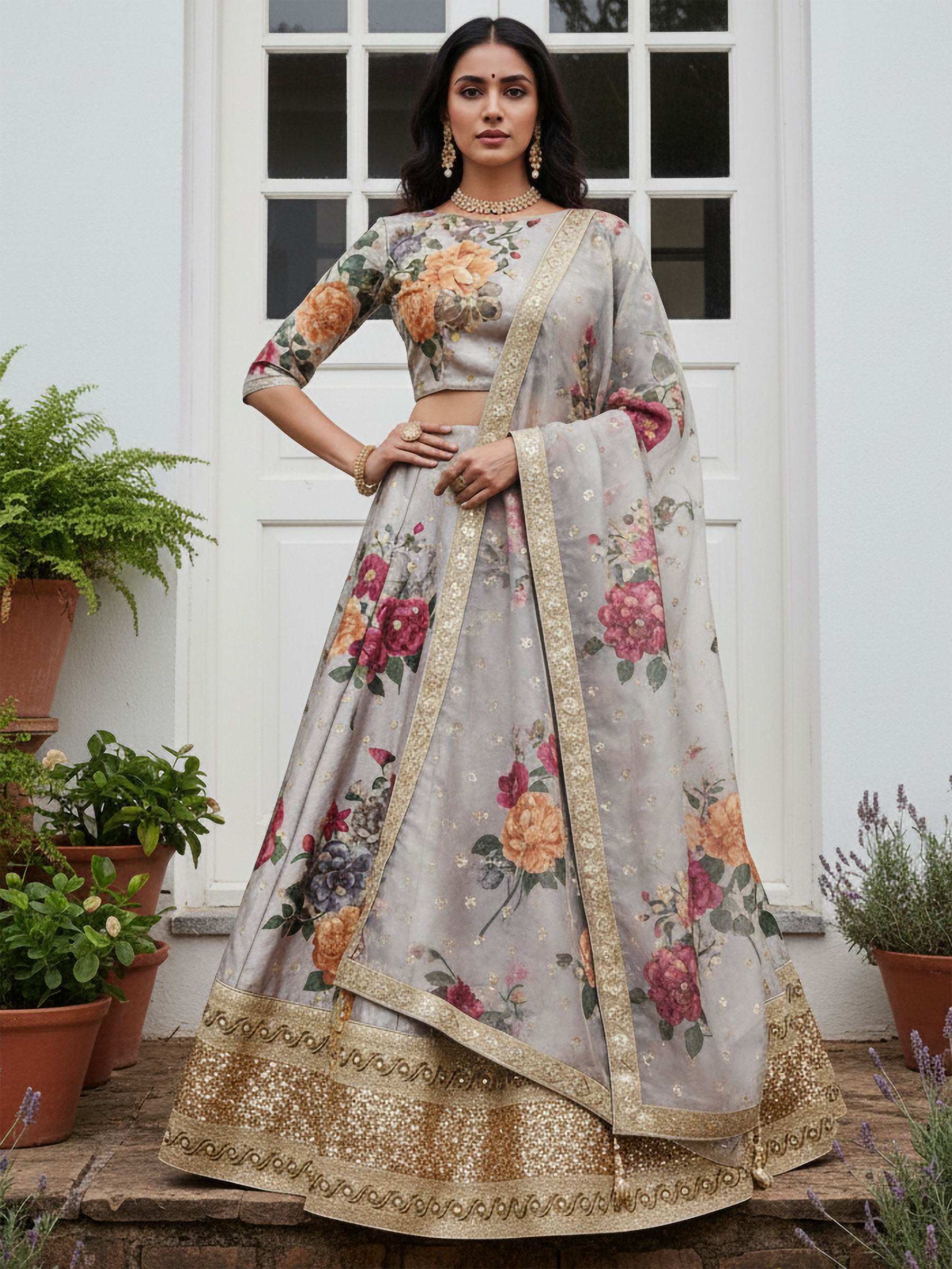 This elegant, floral-printed grey lehenga is crafted in premium net fabric, beautifully adorned with large blooming flower motifs in rich tones. The semi-stitched lehenga comes with a broad golden sequin border that adds a regal charm to the contemporary floral design.