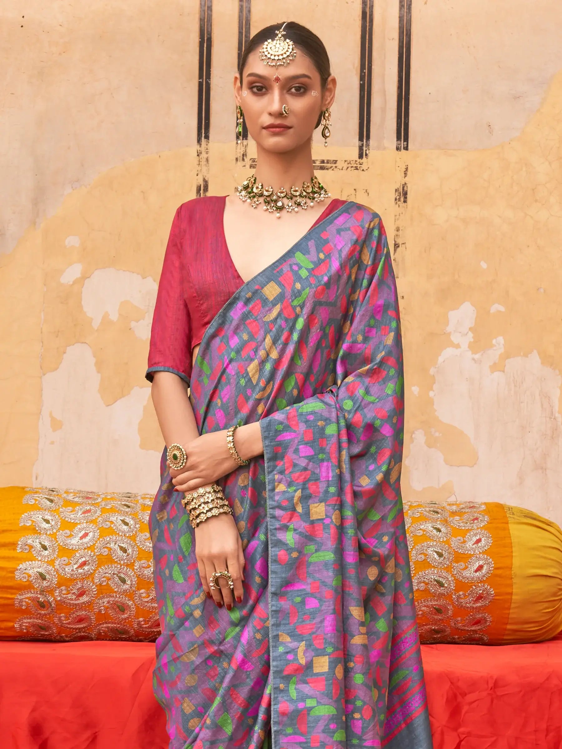 Adorned with multi-color classic digital prints, this saree blends simplicity with charm. The vibrant yet tasteful patterns bring life to the subtle grey base, offering a balanced look that’s stylish but not overdone. It’s ideal for women who appreciate grace in their everyday attire and want something versatile enough to wear from morning to evening.