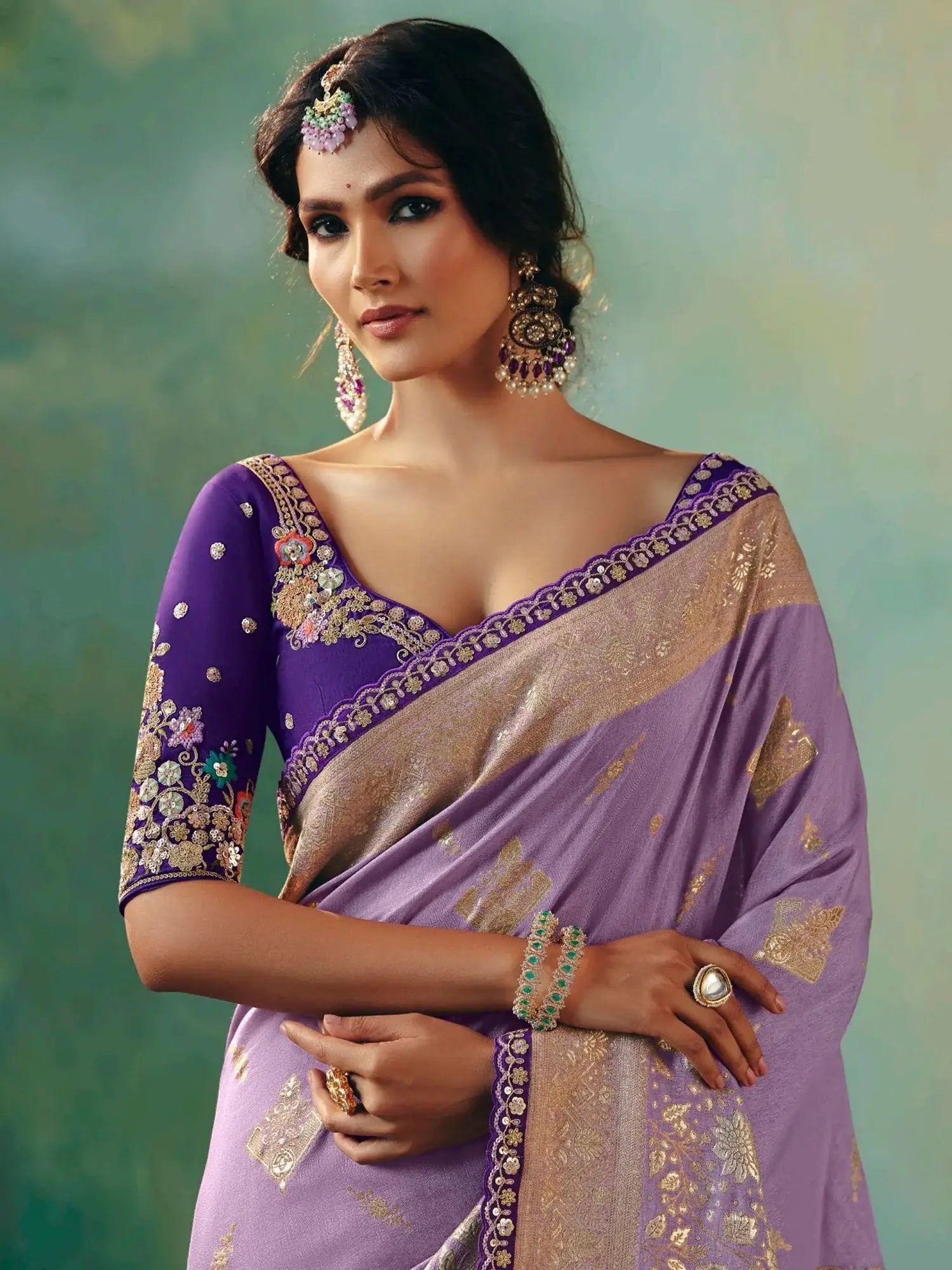 Together, the lavender saree and purple blouse create a regal combination. Ideal for weddings and festive gatherings, this outfit blends tradition with timeless elegance.