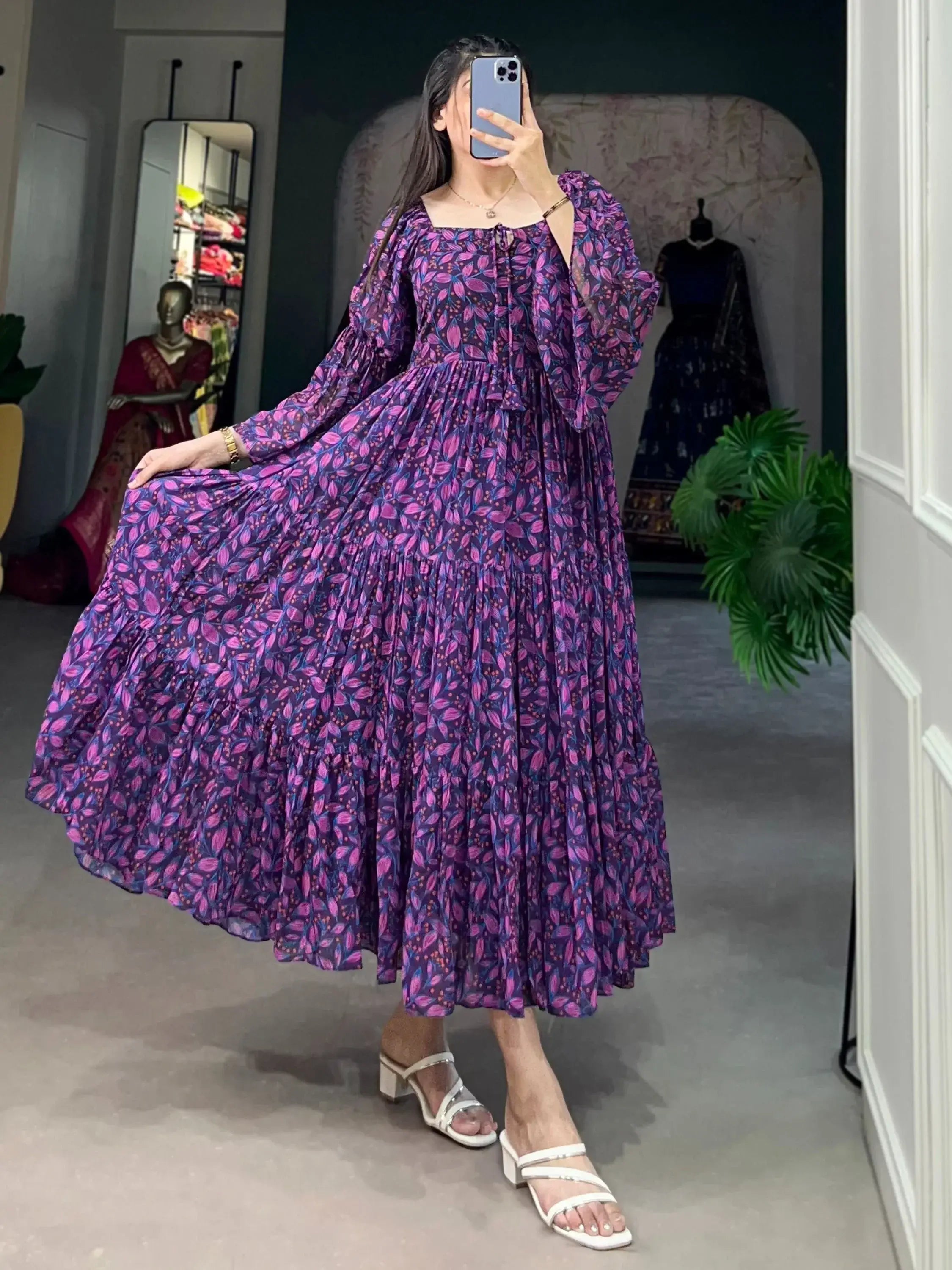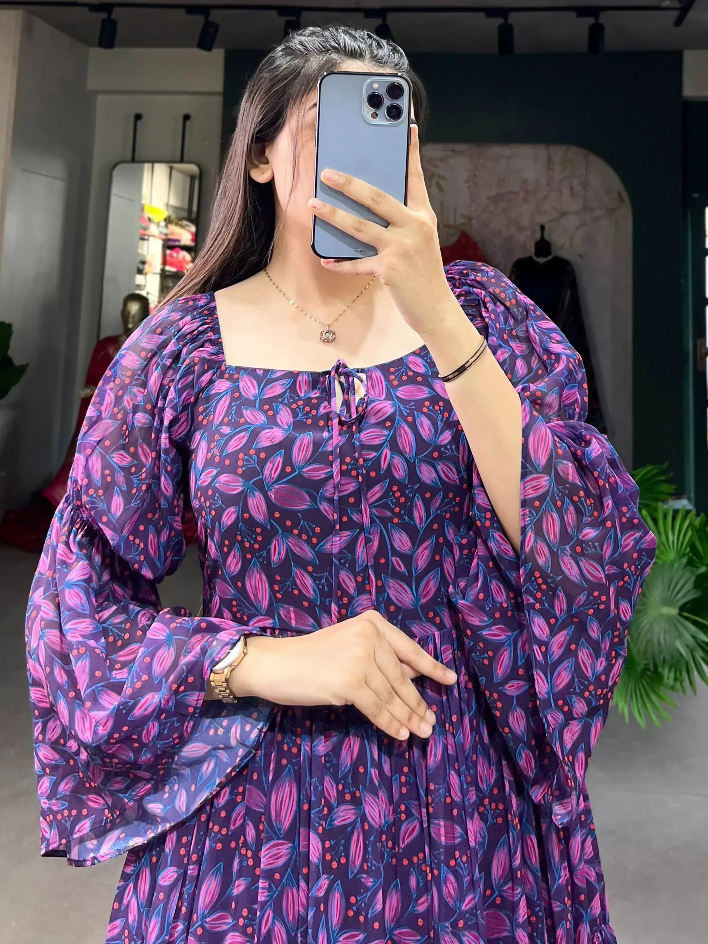 These navy blue frock dresses include beautiful floral printed work that adds a pop of color and detail to the outfit. The georgette fabric is lightweight and comfortable to wear, making it ideal for all-day events. The dresses also come in a compact size, making them easy to store and transport.