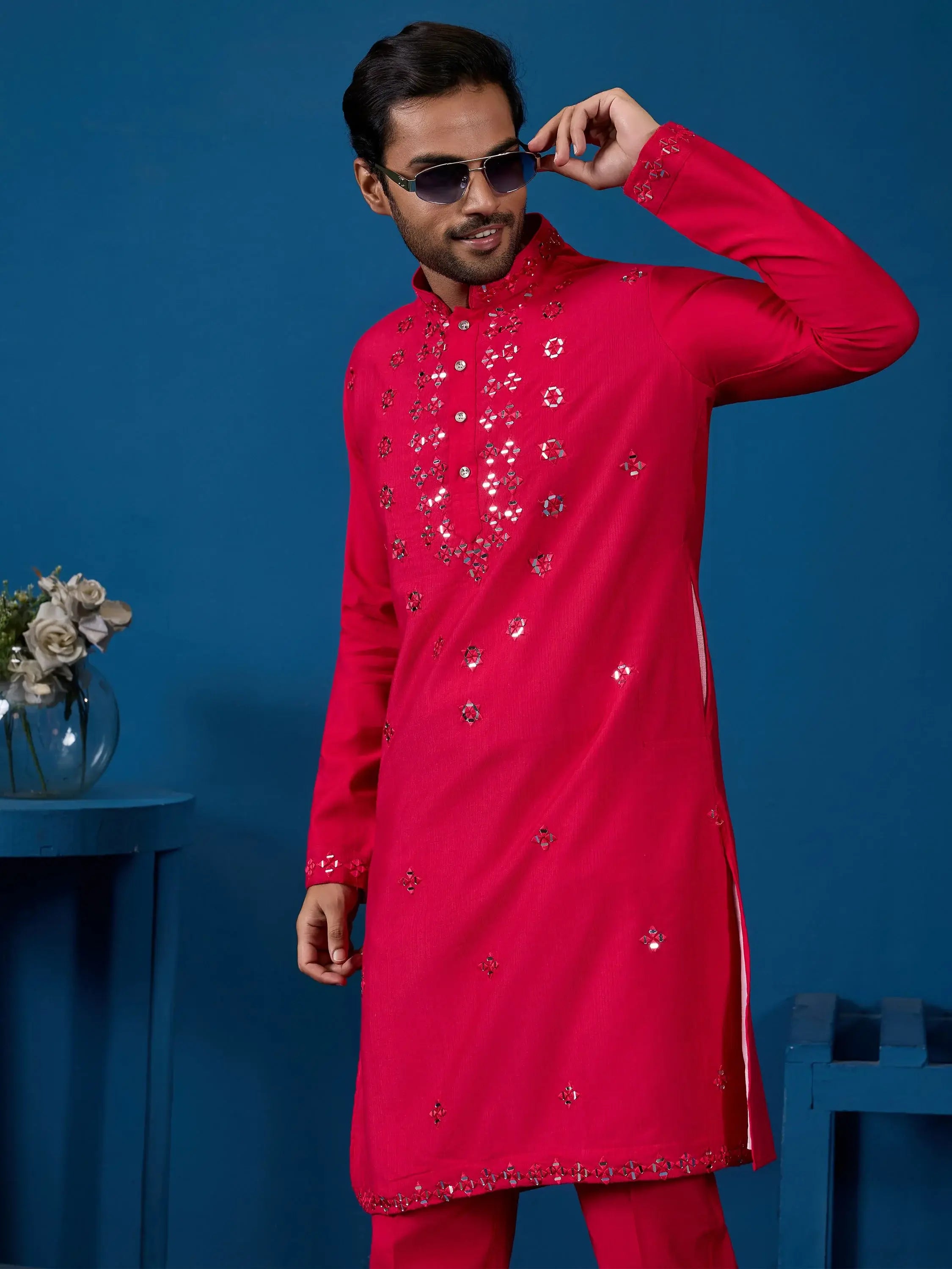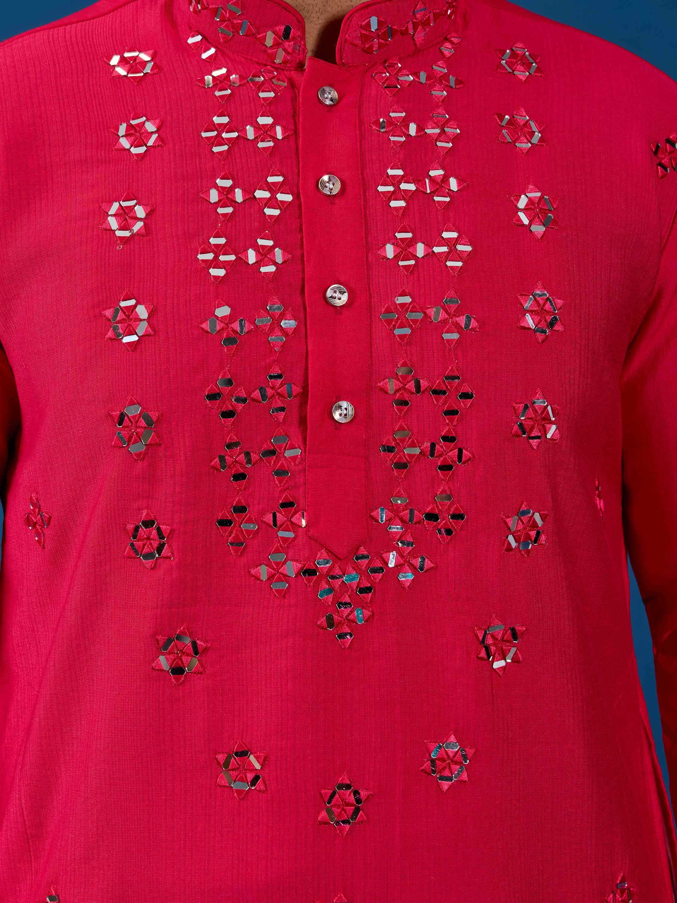 This viscose silk kurta set in a rich ruby red hue radiates festive grandeur and sophistication. The mirror work detailing across the front, cuffs, and collar reflects a contemporary royal vibe that’s perfect for celebrations.