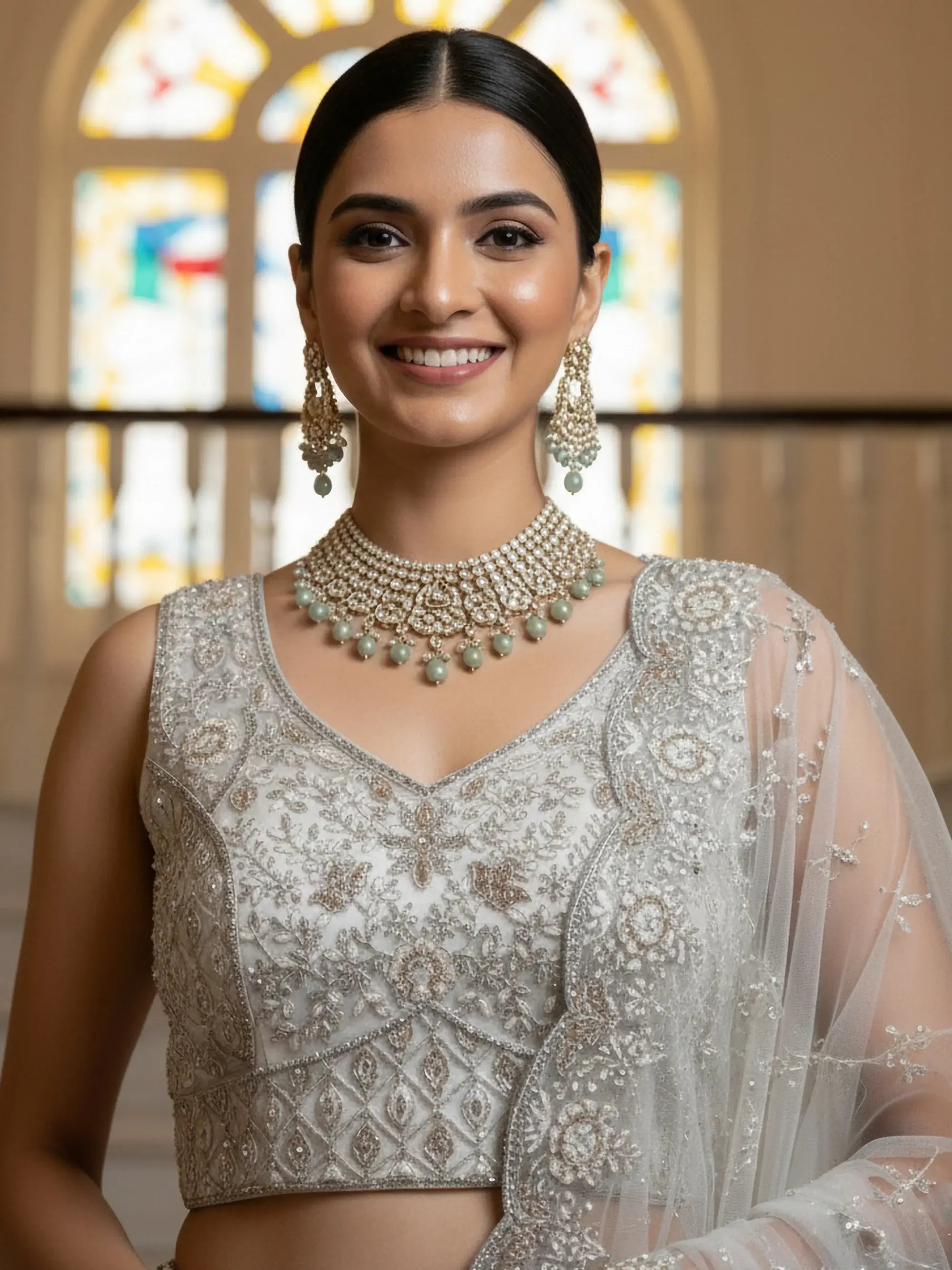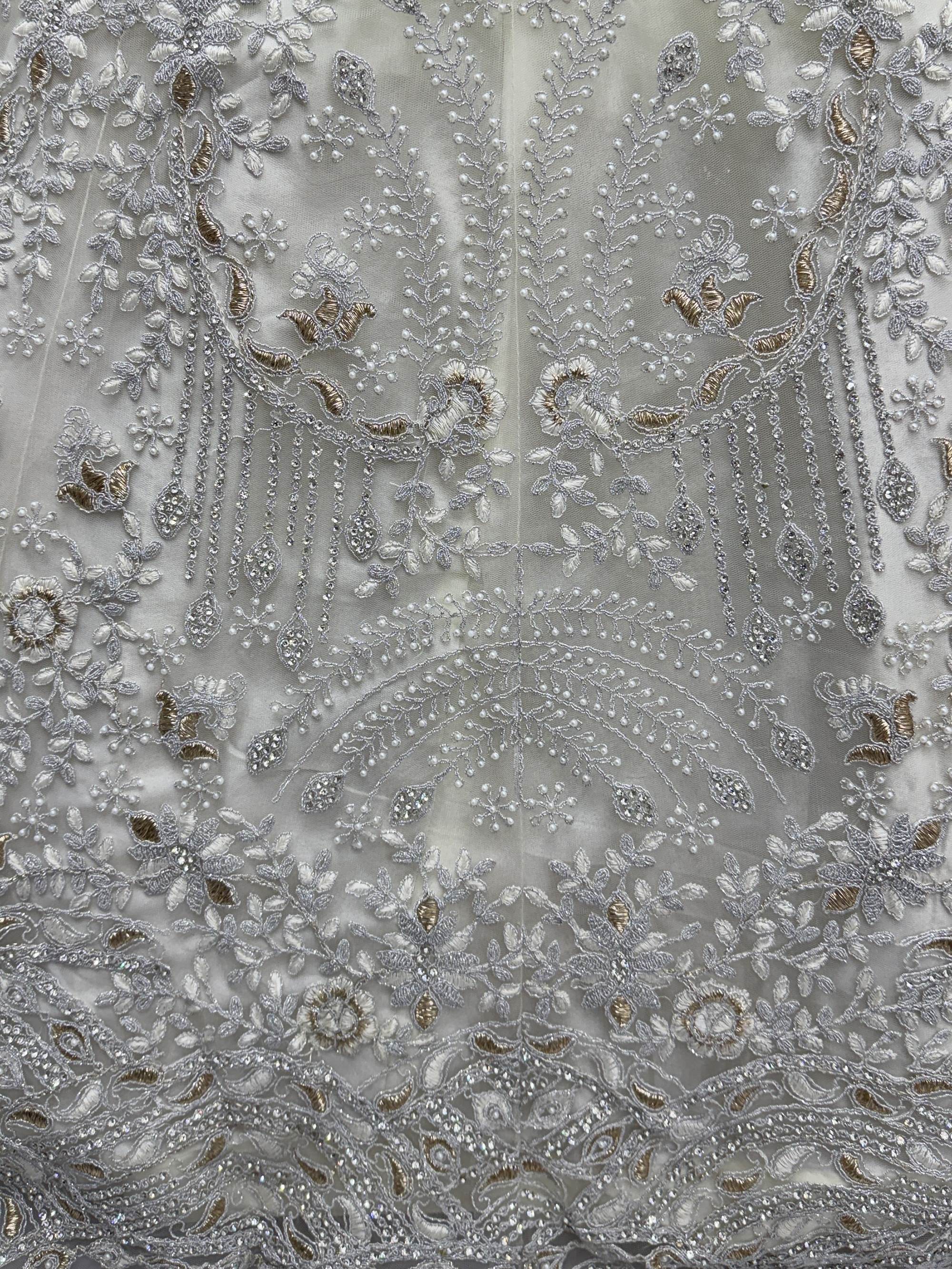 This elegant white lehenga choli radiates bridal sophistication with its luxurious net fabric. The ensemble is adorned with stunning zircon diamonds, pearl beads, and intricate embroidery.