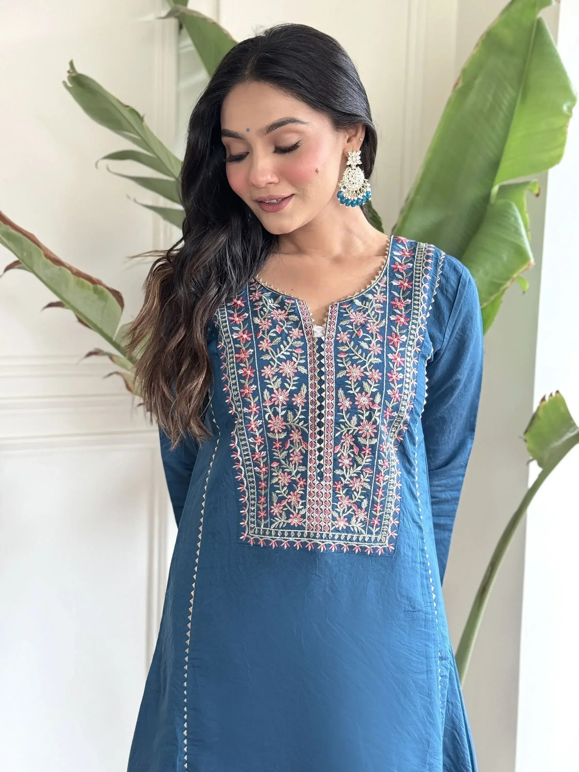 Step into elegance with these beautifully crafted blue suits that seamlessly marry traditional artistry with modern flair. Made from luxurious Chanderi silk, this fully-stitched ensemble showcases a stunning combination of grace and contemporary style that is sure to captivate.