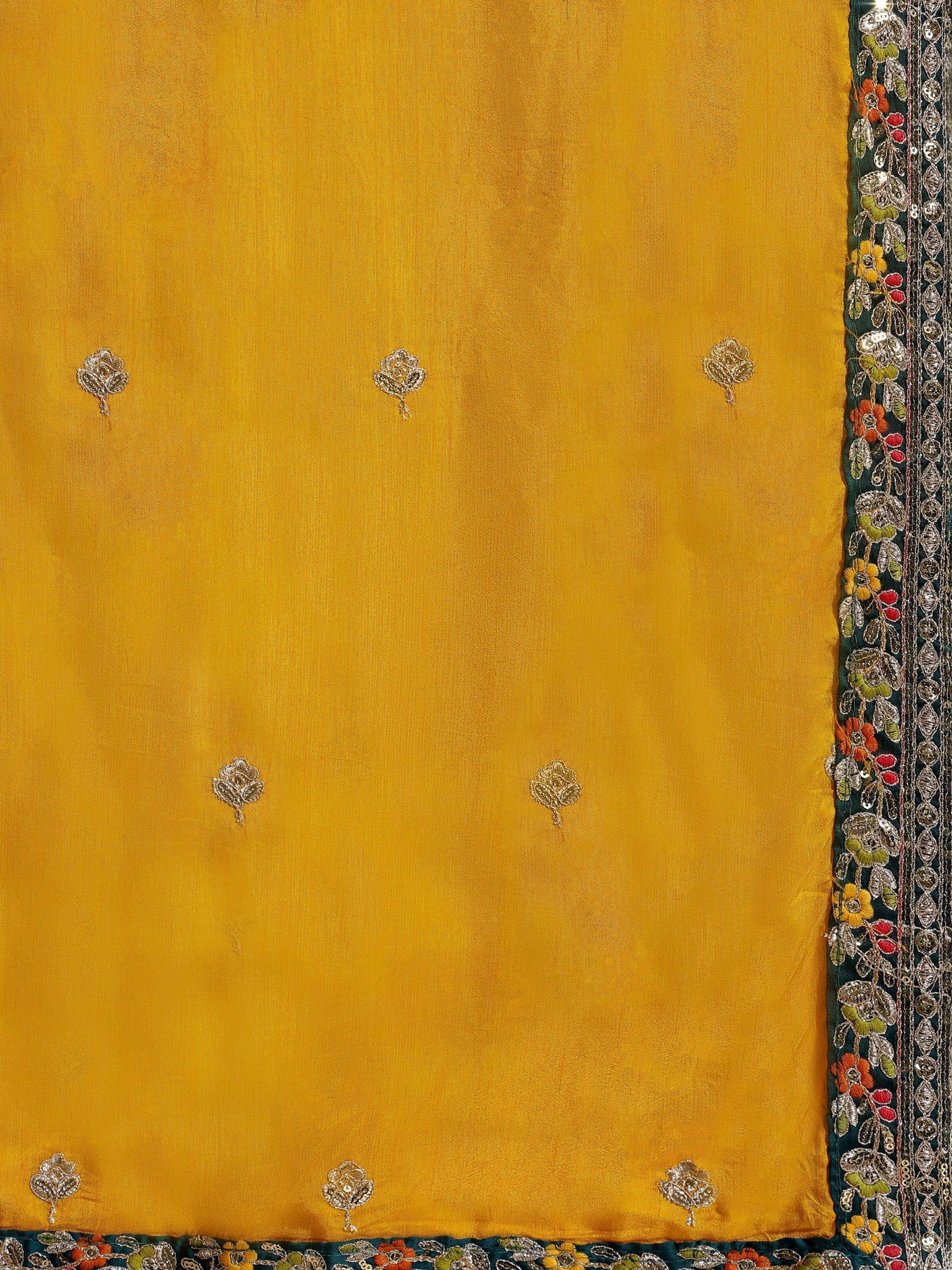 Adding a pop of color and contrast to the ensemble is a yellow chinon dupatta, adorned with sparkling sequin work and designer lace accents. The vibrant hue of the dupatta adds a playful touch to the outfit, while its lightweight fabric drapes elegantly, completing the look with a dash of elegance and sophistication.
