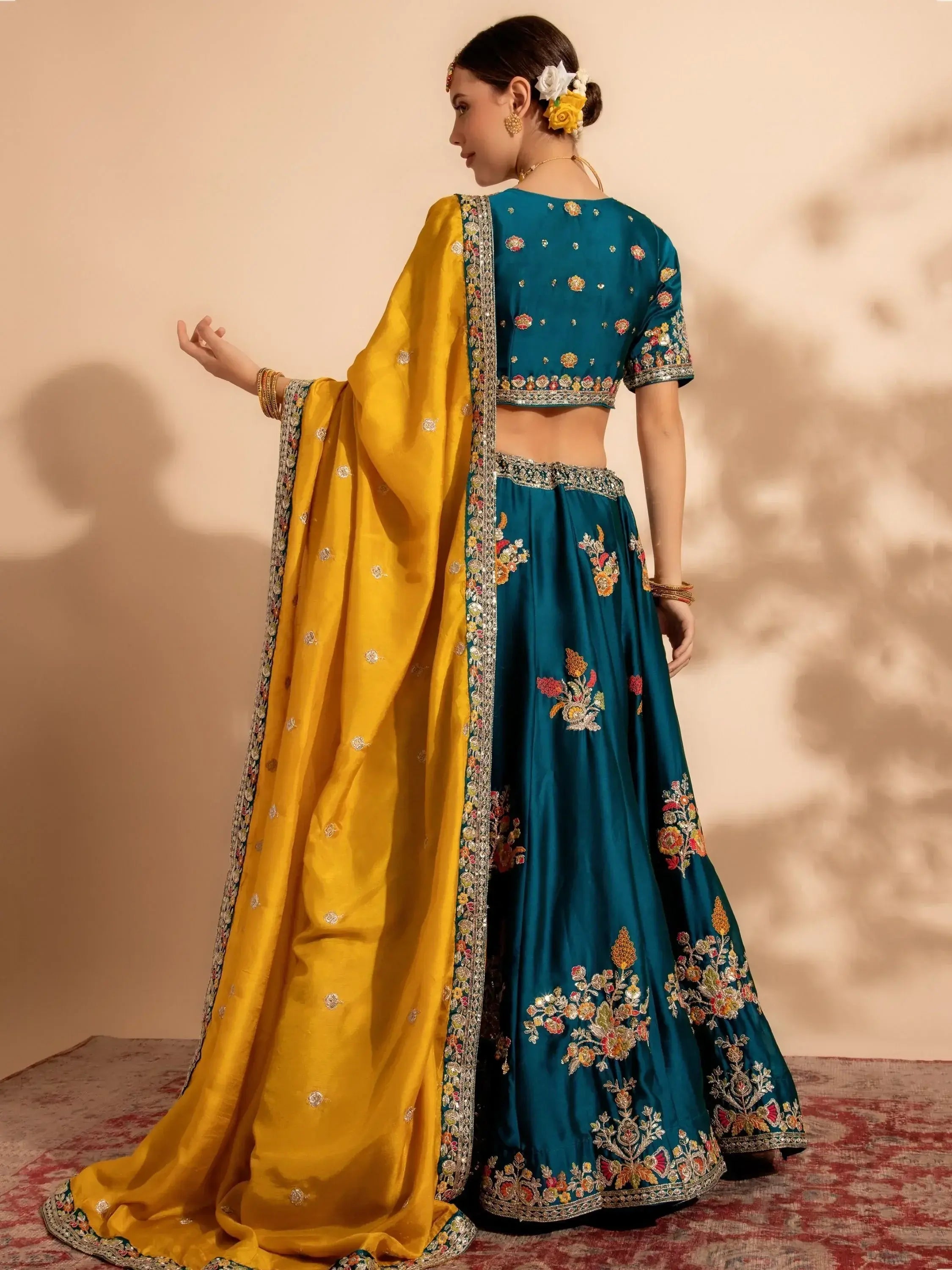 Accompanying the lehenga is a georgette choli in a complementary blue hue, embellished with intricate threadwork and sequins that enhance its allure. The choli's tailored fit and attention to detail ensure both comfort and style, making it an ideal choice for weddings, festivities, and celebrations of all kinds.