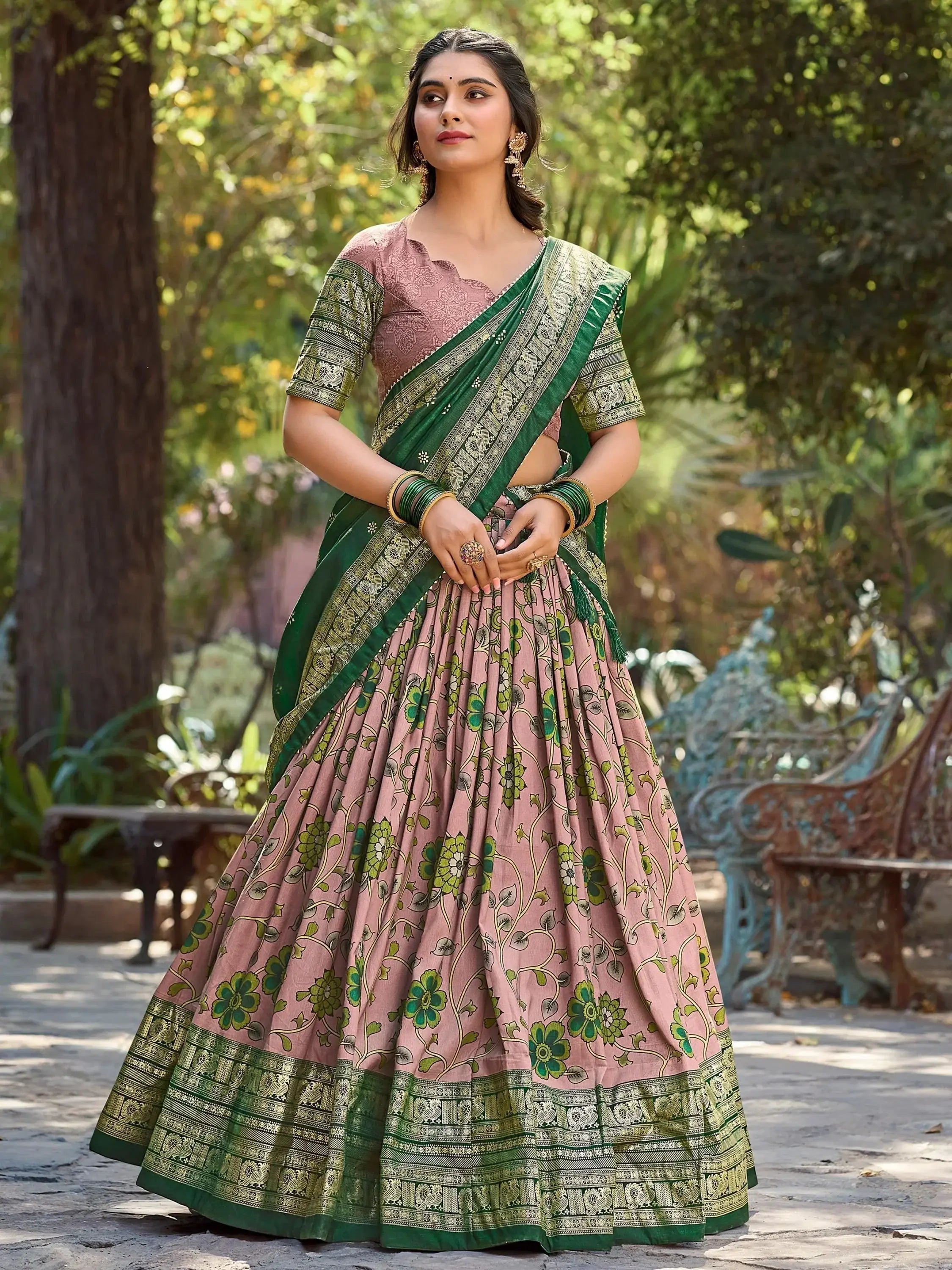 Indulge in the ethereal allure of this dusty pink tussar silk lehenga adorned with intricate kalamkari print and shimmering foil work, a true masterpiece that embodies elegance and sophistication. Crafted to perfection, this ensemble features a gracefully stitched lehenga, boasting a circumference of 42 inches and a luxurious 3.80-meter flair, ensuring a regal silhouette that commands attention with every step.