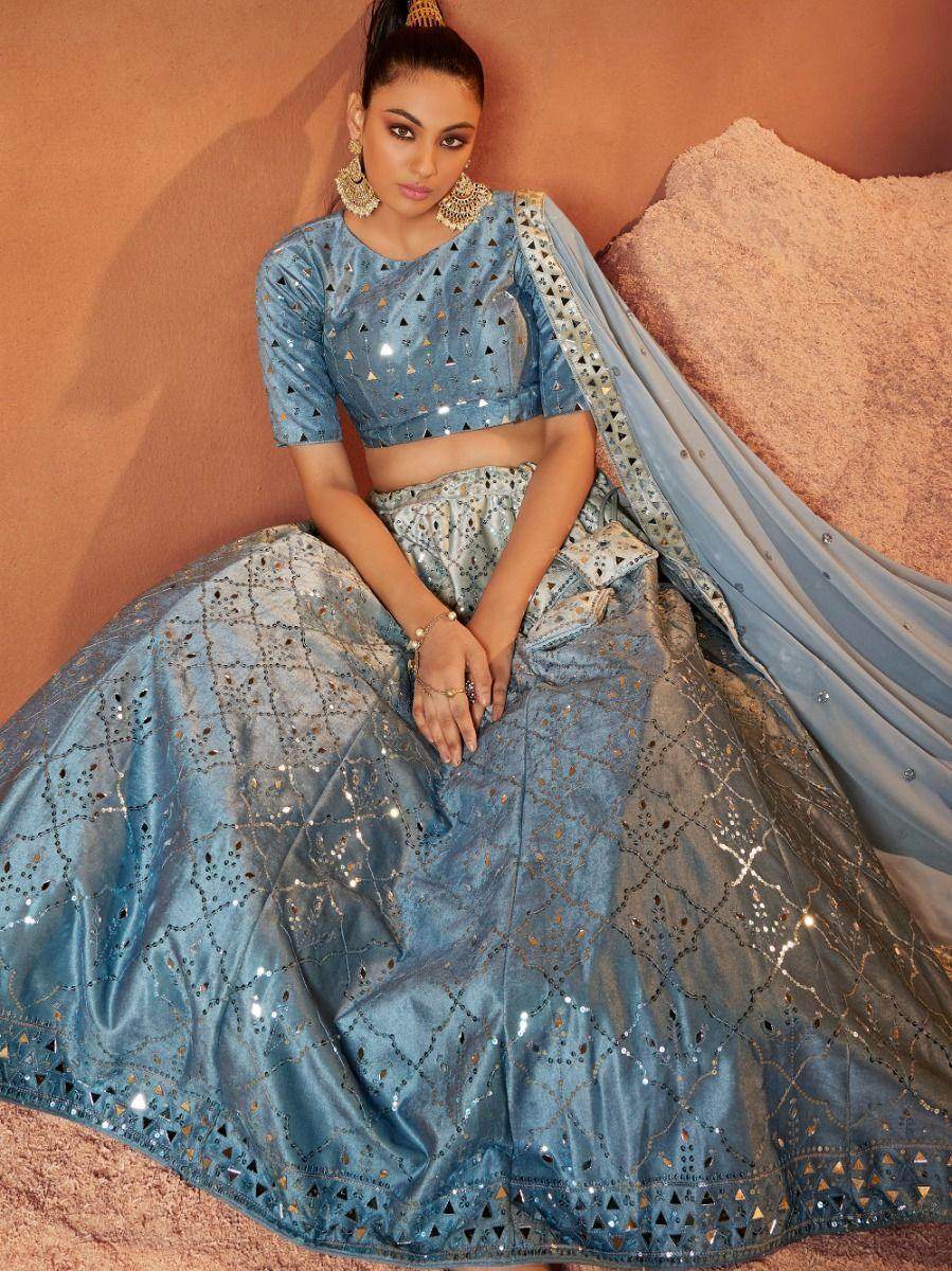 Be the center of the attraction by donning this beautiful dusty-sky-color sequin lehenga choli. This dusty-sky color lehenga is made of velvet material embellished with sequins embroidery with all-over mirror work.