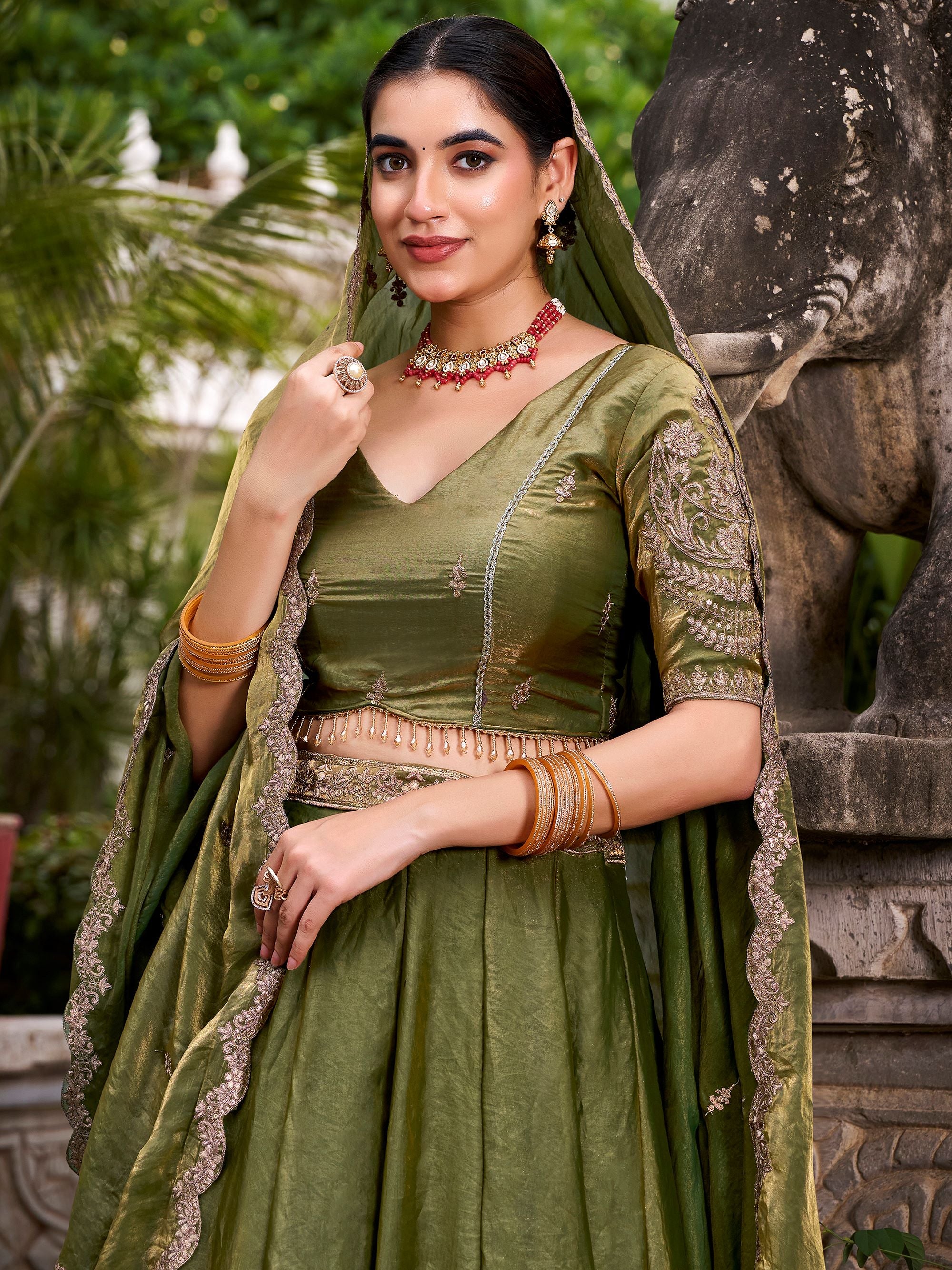 The lehenga is crafted from luxurious organza fabric in a rich olive-green shade that gives a royal and glossy appeal. It features sequins and thread embroidery work along the belt and all over the flair, adding a sophisticated, festive sparkle.