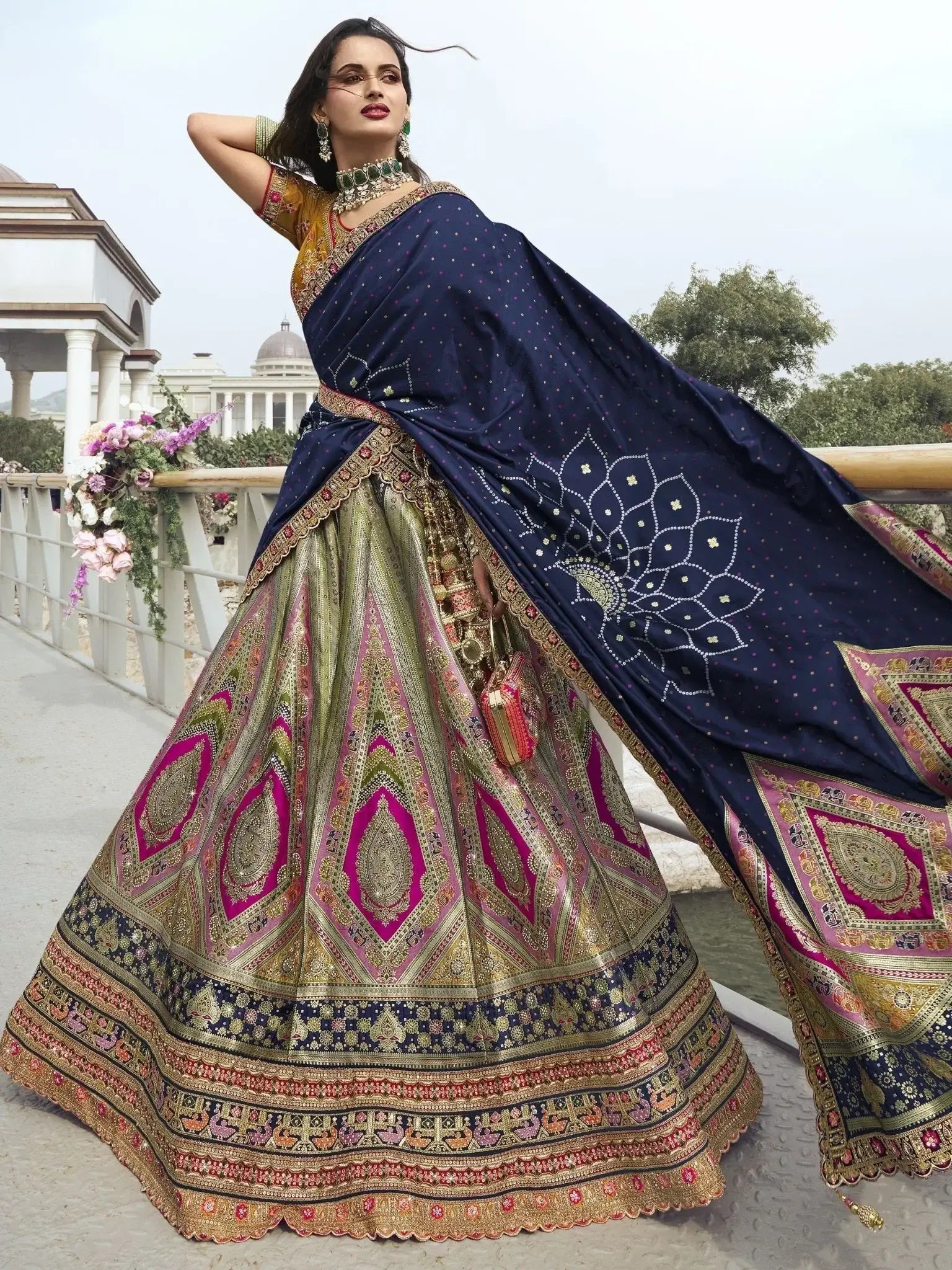 The vibrant green lehenga is complemented by a matching mustard yellow blouse, also in banarasi silk, and an embroidered waist belt with latkan, enhancing the overall elegance of the ensemble. The semi-stitched design allows for a customizable fit, with the choli material being fully unstitched and adjustable up to 42 inches.