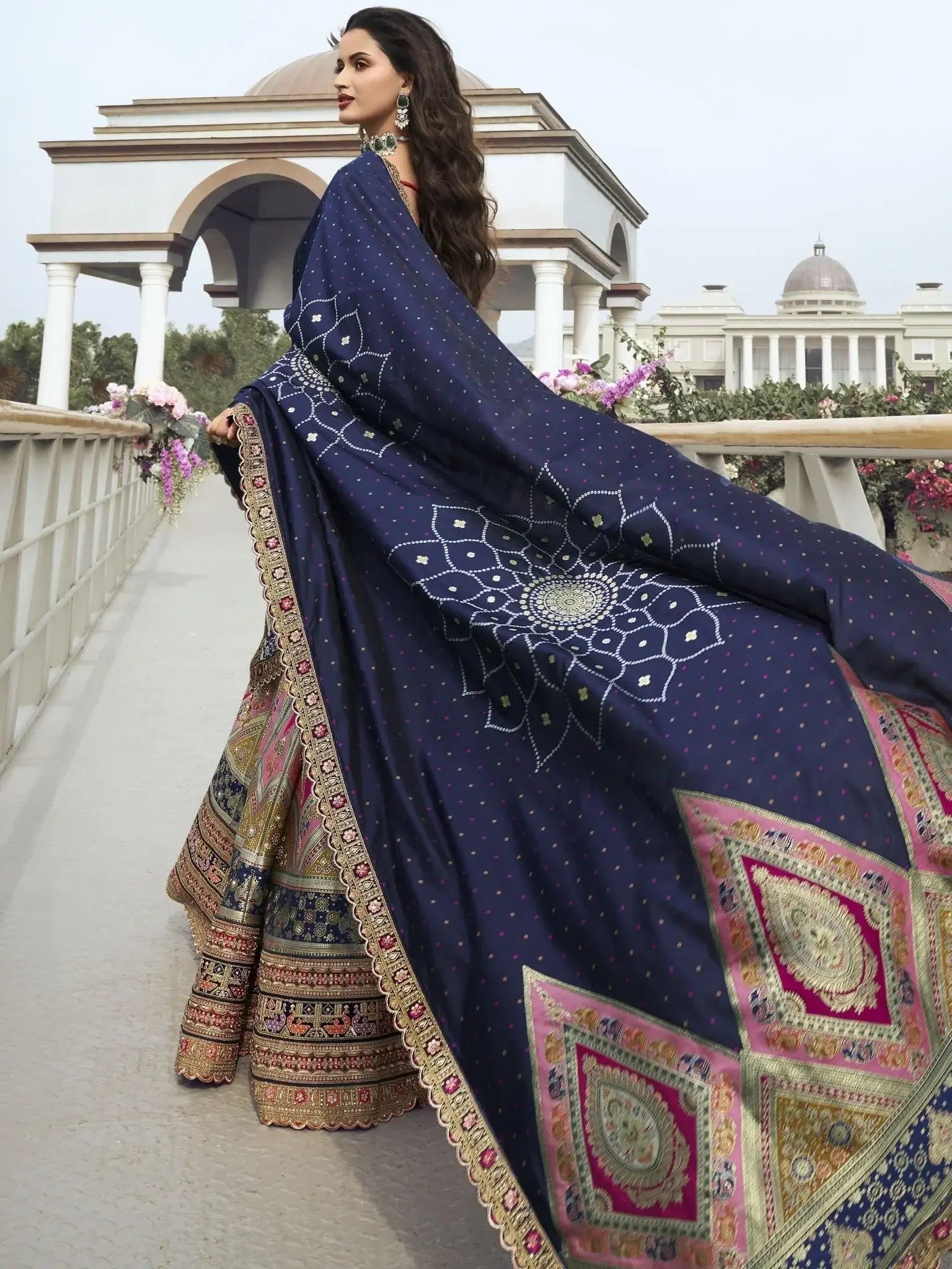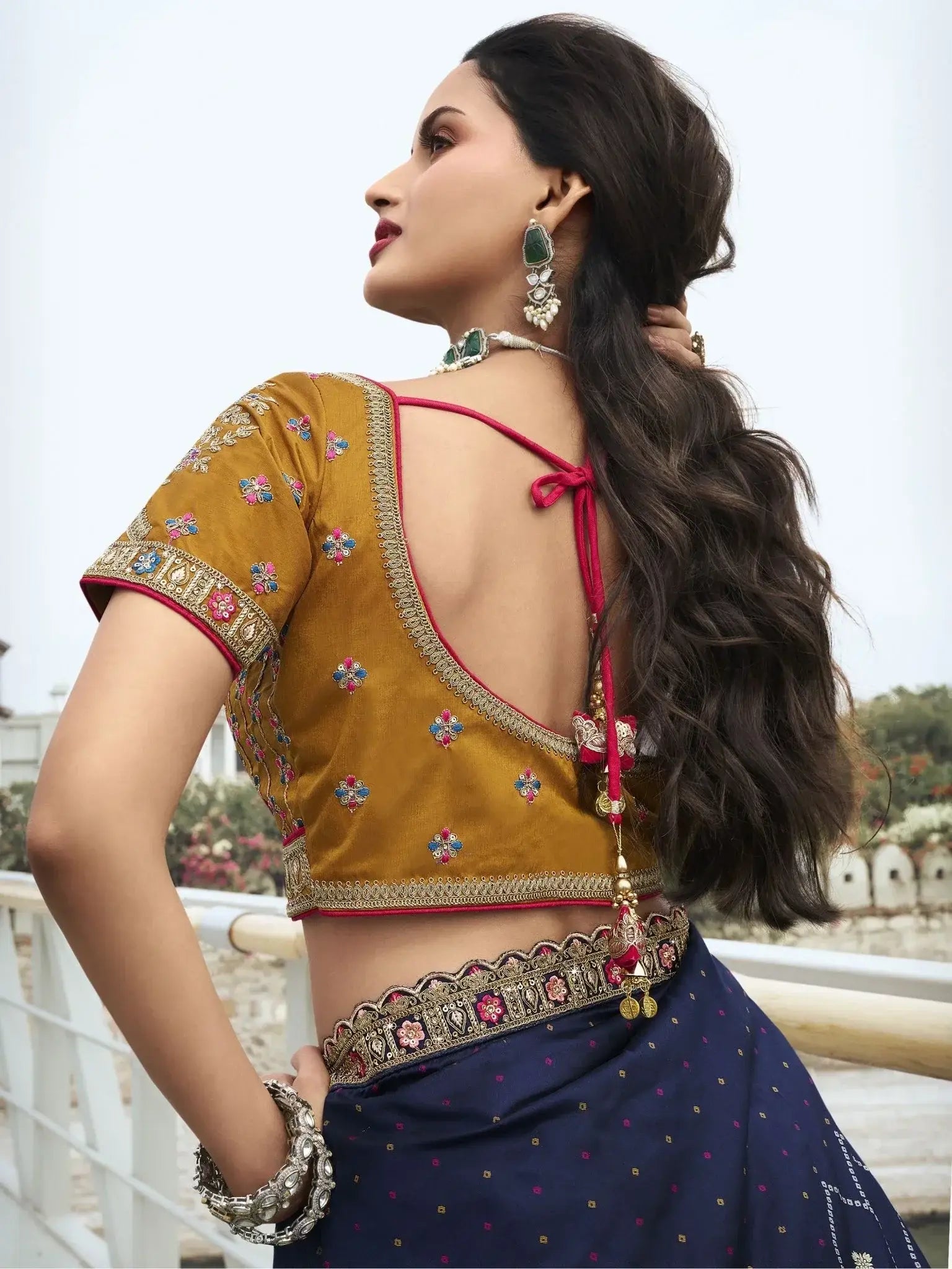 Adding to the lehenga's charm is the navy blue dupatta, made from banarasi silk and adorned with the same intricate zari, thread embroidery, and sequins work. This elegant dupatta perfectly complements the lehenga, creating a cohesive and graceful look.