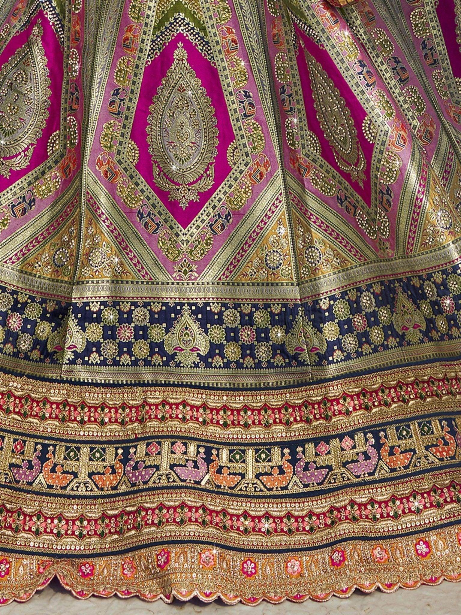 Discover the allure of our beautiful green embroidered silk wedding lehenga choli from Ethnic Plus. This exquisite lehenga, crafted from luxurious banarasi silk, features intricate zari, thread embroidery, and sequins work, creating a stunning visual appeal.