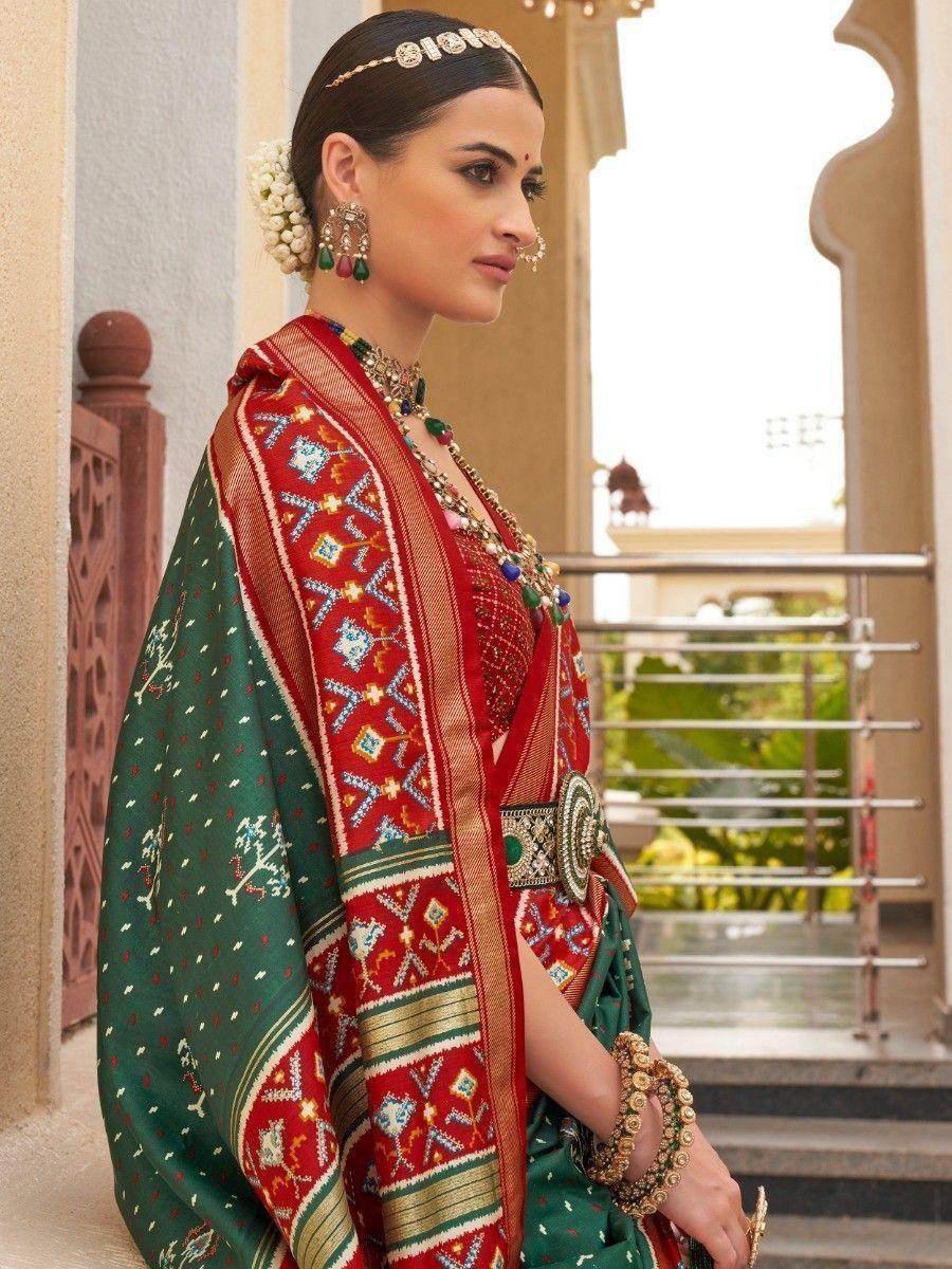 With its beautiful traditional look, this green silk saree is perfect for weddings, festivals, and other special occasions. Designed with utmost care, this saree features a vibrant green color with exquisite patola printed work all over. The intricate work adds a touch of elegance to the saree, making it a must-have in your wardrobe.