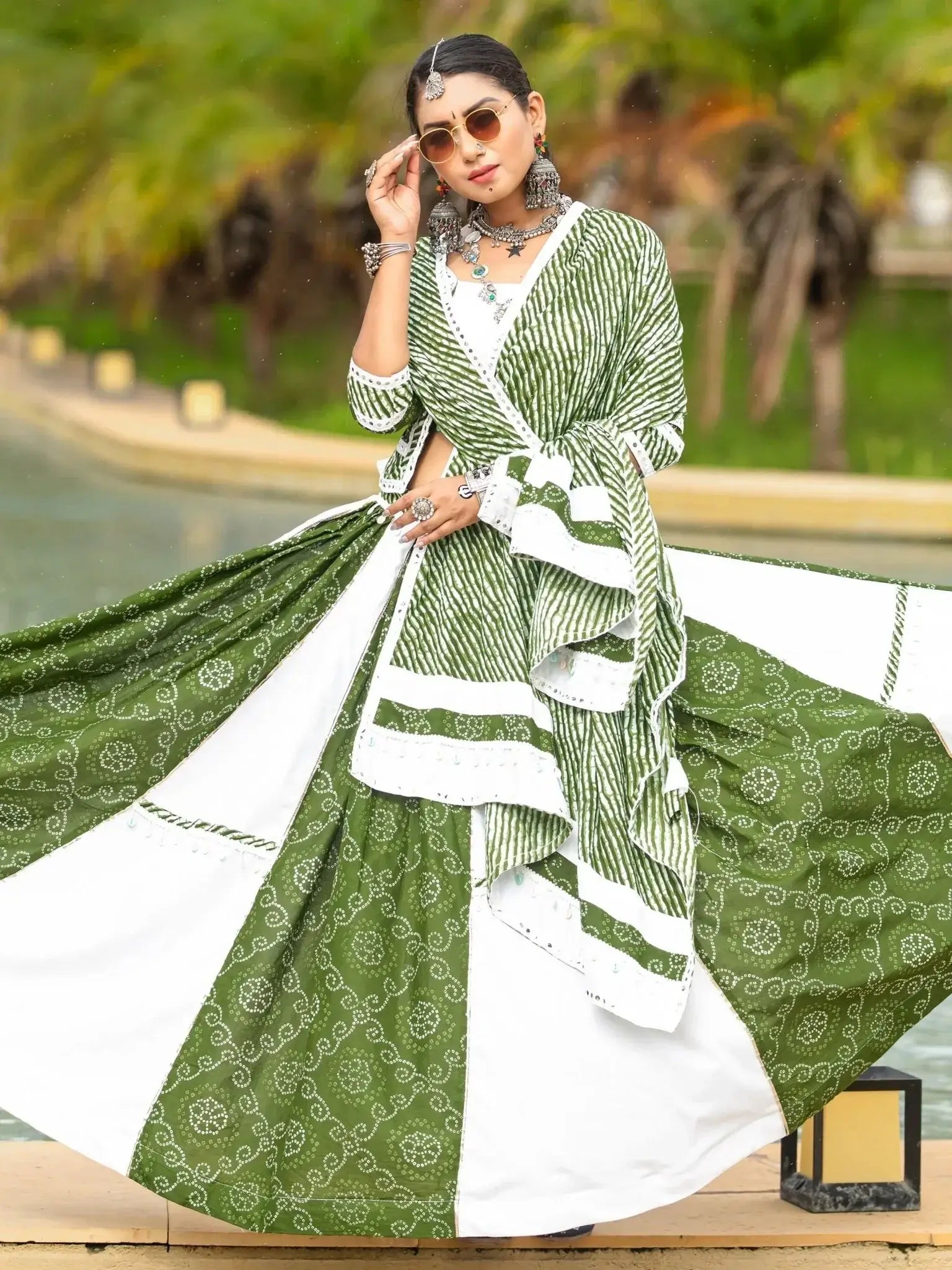 Embrace the festive spirit with this exquisite green and white navratri lehenga choli from ethnic plus. Designed with intricate kodi work, mirror embellishments, and delicate lace details, this lehenga combines traditional elegance with modern flair.