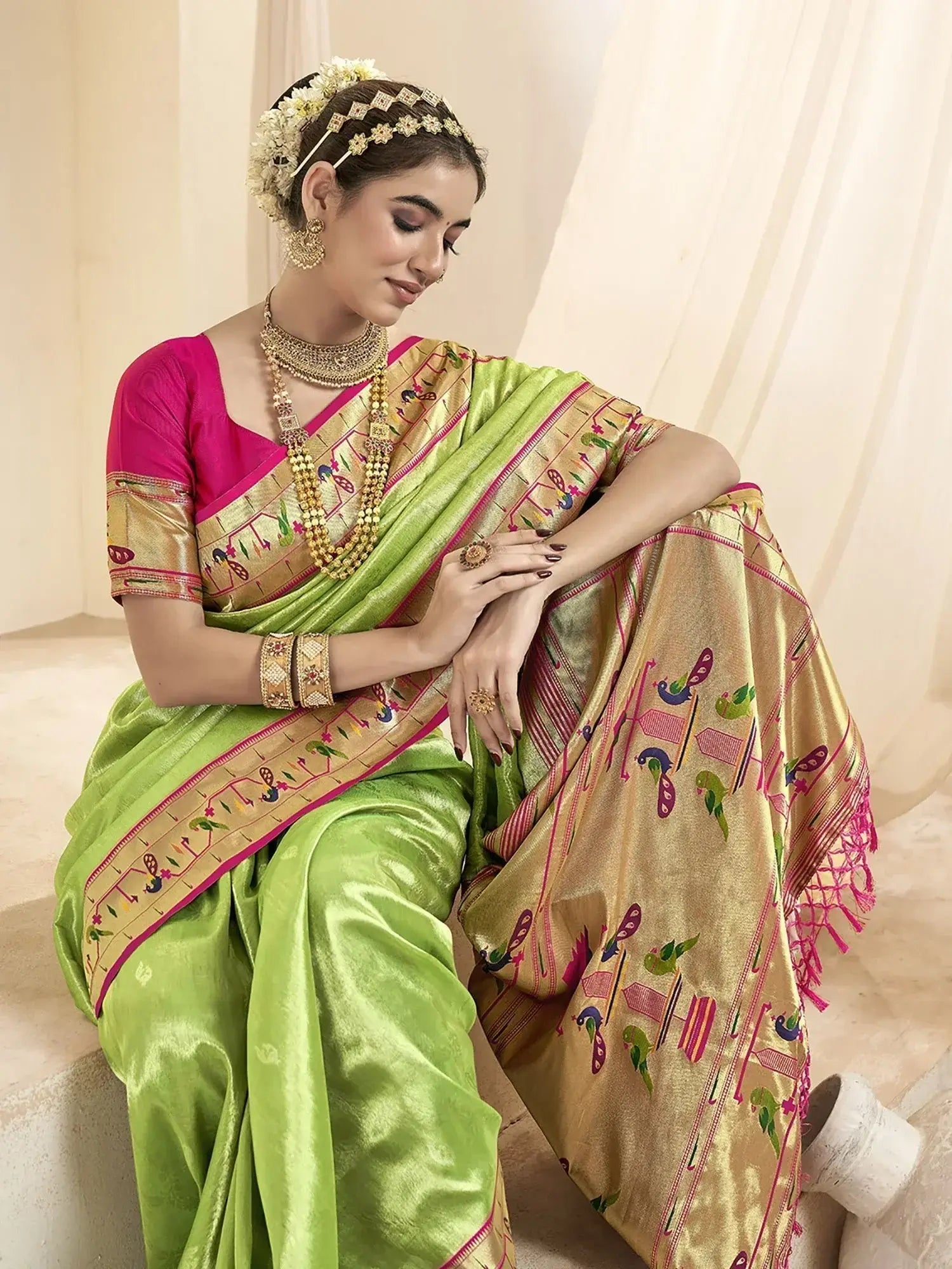 This saree includes a vibrant green color, intricate zari weaving work, contrasting paithni border work, attached tassels on the pallu, and luxurious tissue silk material. Each feature adds a unique touch to the saree, making it a must-have for any ethnic wear lover.