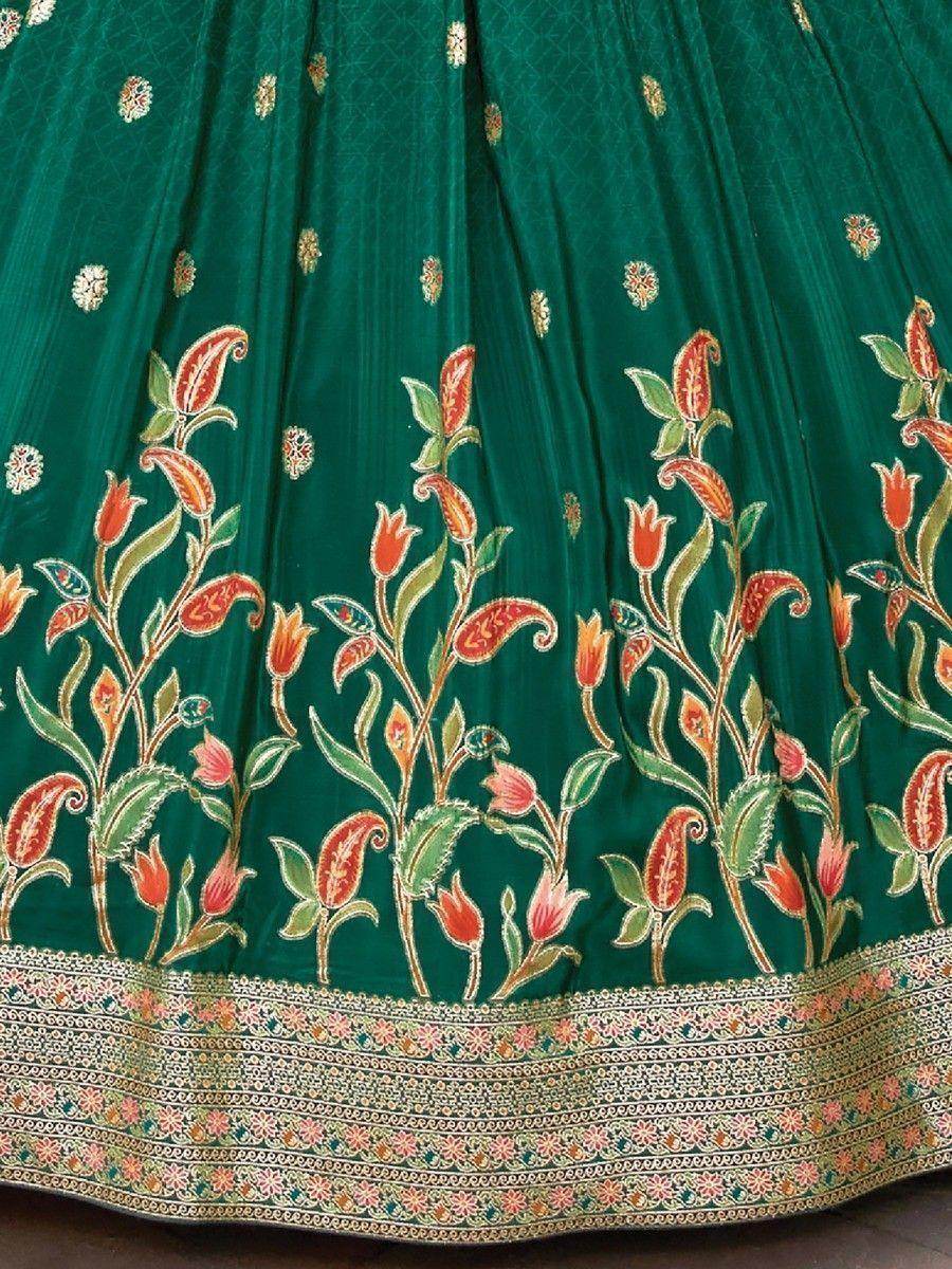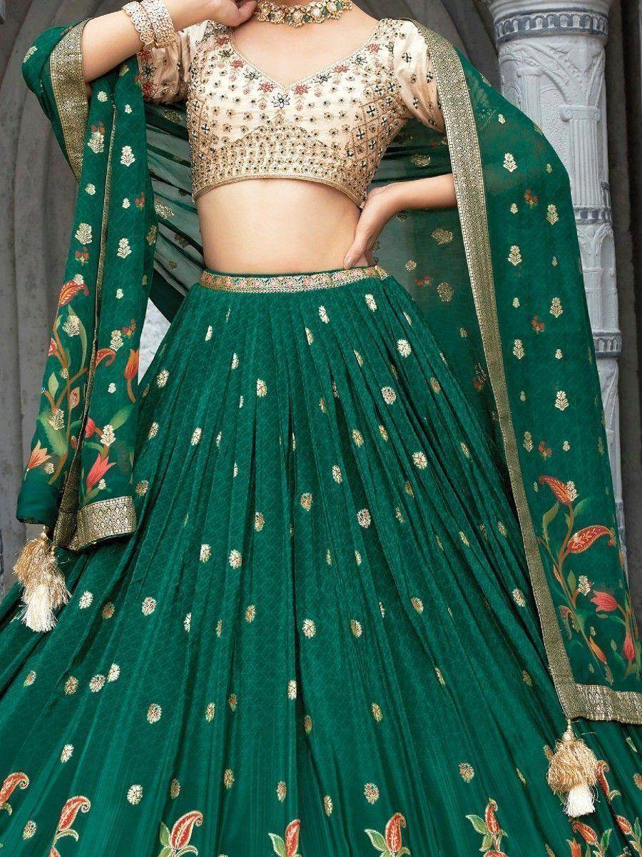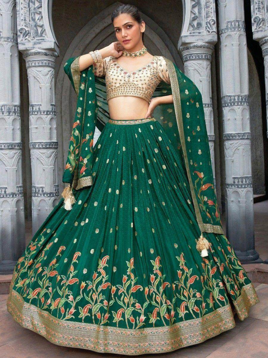 Introducing our beautiful green zari weaving silk lehenga choli with dupatta, a ready-to-wear ensemble designed for modern women who want to create stylish looks for various functions, weddings, and receptions. Made from high-quality green silk material, this lehenga choli features exquisite zari weaving work that adds a touch of elegance and sophistication to your ensemble.