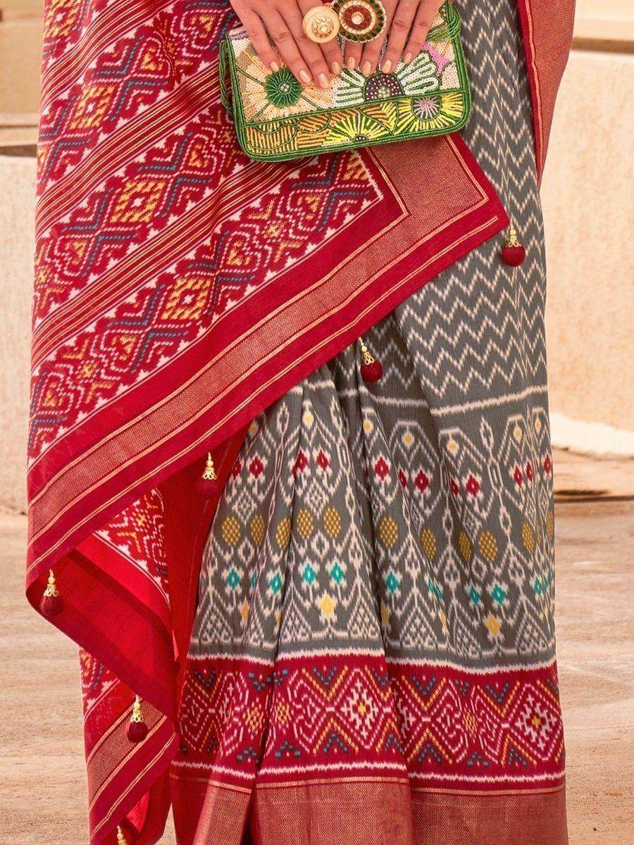 This beautiful saree is made from high-quality silk material that exudes a luxurious sheen. The grey and red color combination lends a captivating allure to the saree, making it a perfect choice for special occasions. Whether it's a wedding, festival, or any other grand celebration, this saree will surely make you stand out from the crowd.