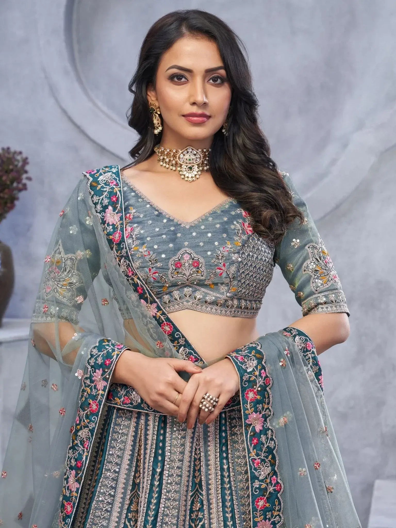 This exquisite ensemble features intricate sequin work, stone work, thread embroidery, and zari weaving work on the grey organza lehenga, choli, and net dupatta.