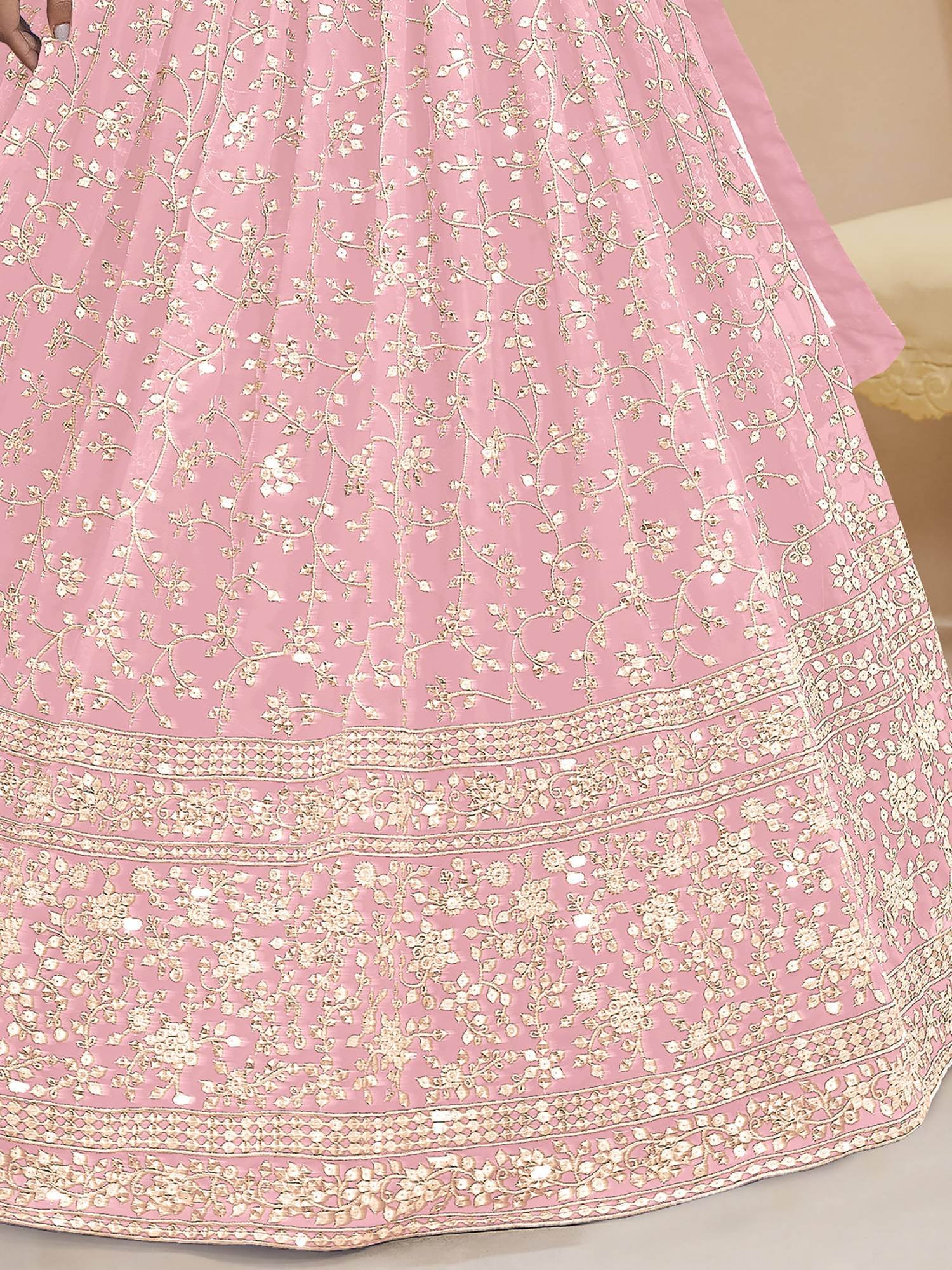 The lehenga is crafted from high-quality georgette material in a stunning light pink color. It features intricate sequin work, zari work, and embroidery work, adding a touch of glamour and sophistication. The delicate and intricate details make this lehenga a true work of art.