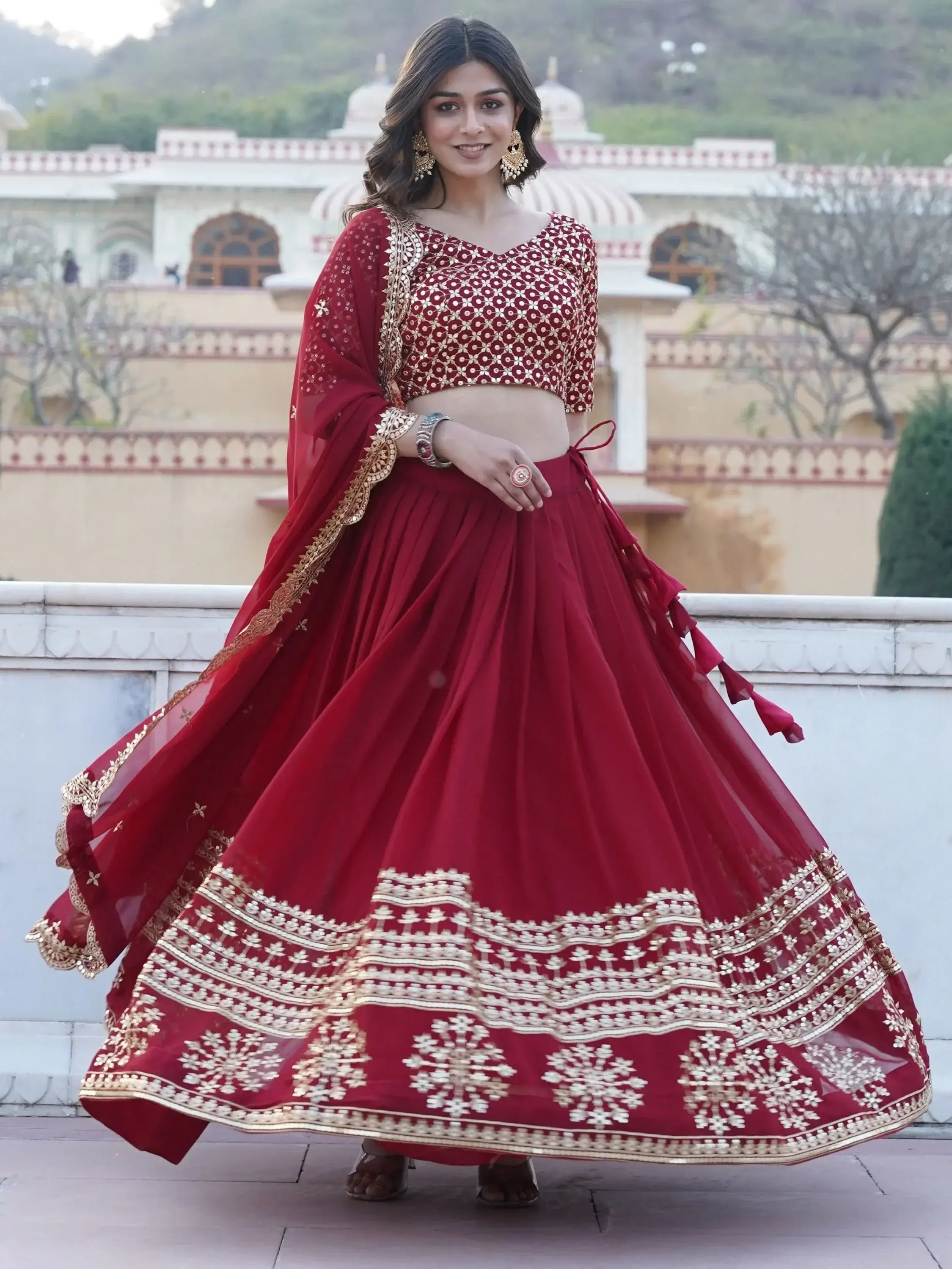Drape this maroon lehenga choli at weddings, functions, and special occasions to make a lasting impression. Pair it with a trendy bun hairstyle and a set of heels to elevate your style and create unforgettable memories on your special day.