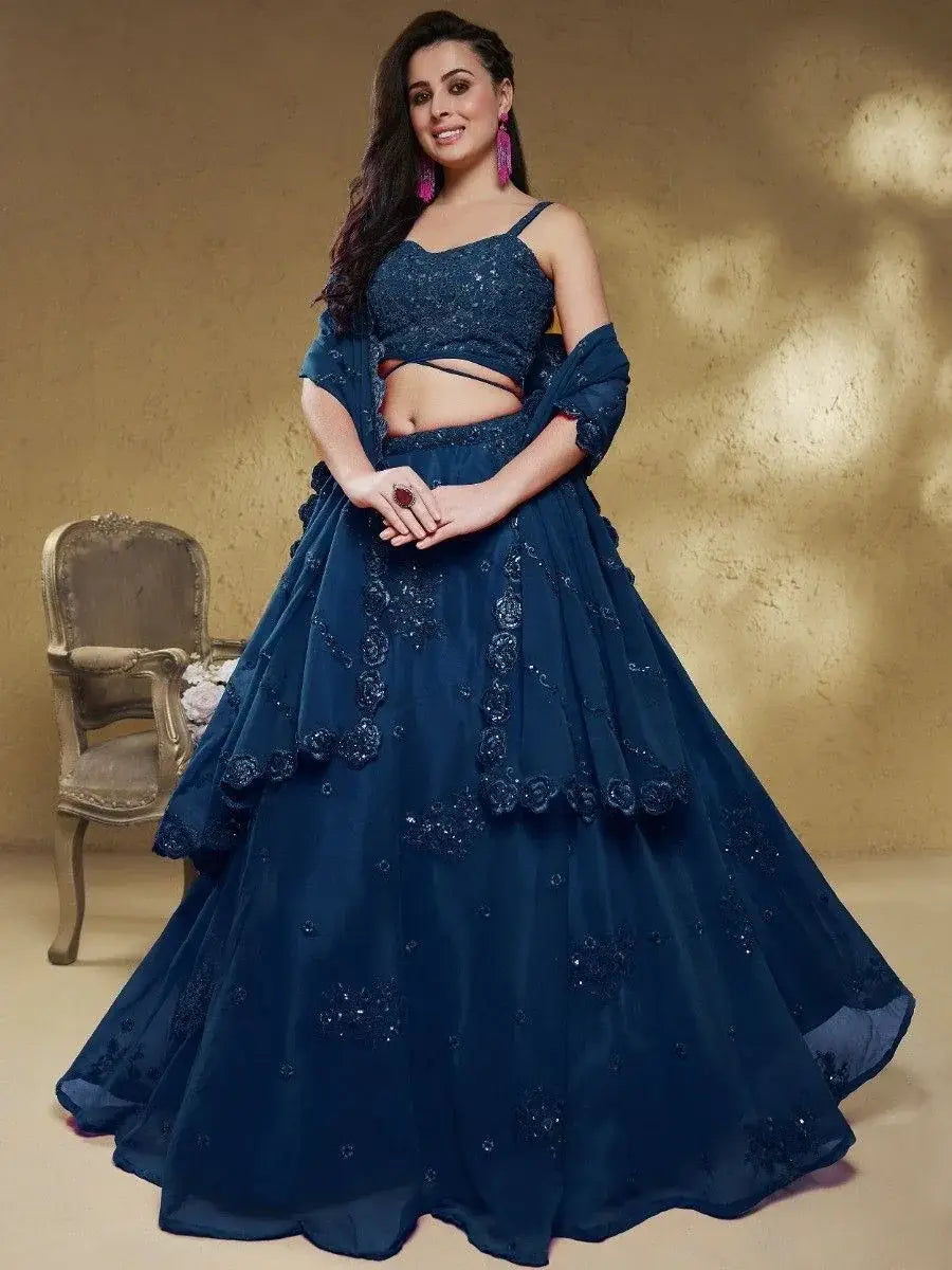 Introducing our beautiful navy blue sequins georgette reception wear lehenga choli, a stunning and stylish ensemble that is sure to make heads turn on any occasion. This exquisite lehenga choli set is designed with intricate details, including dori work, glitter sequin work, and embroidery work, making it a truly unique and eye-catching piece.