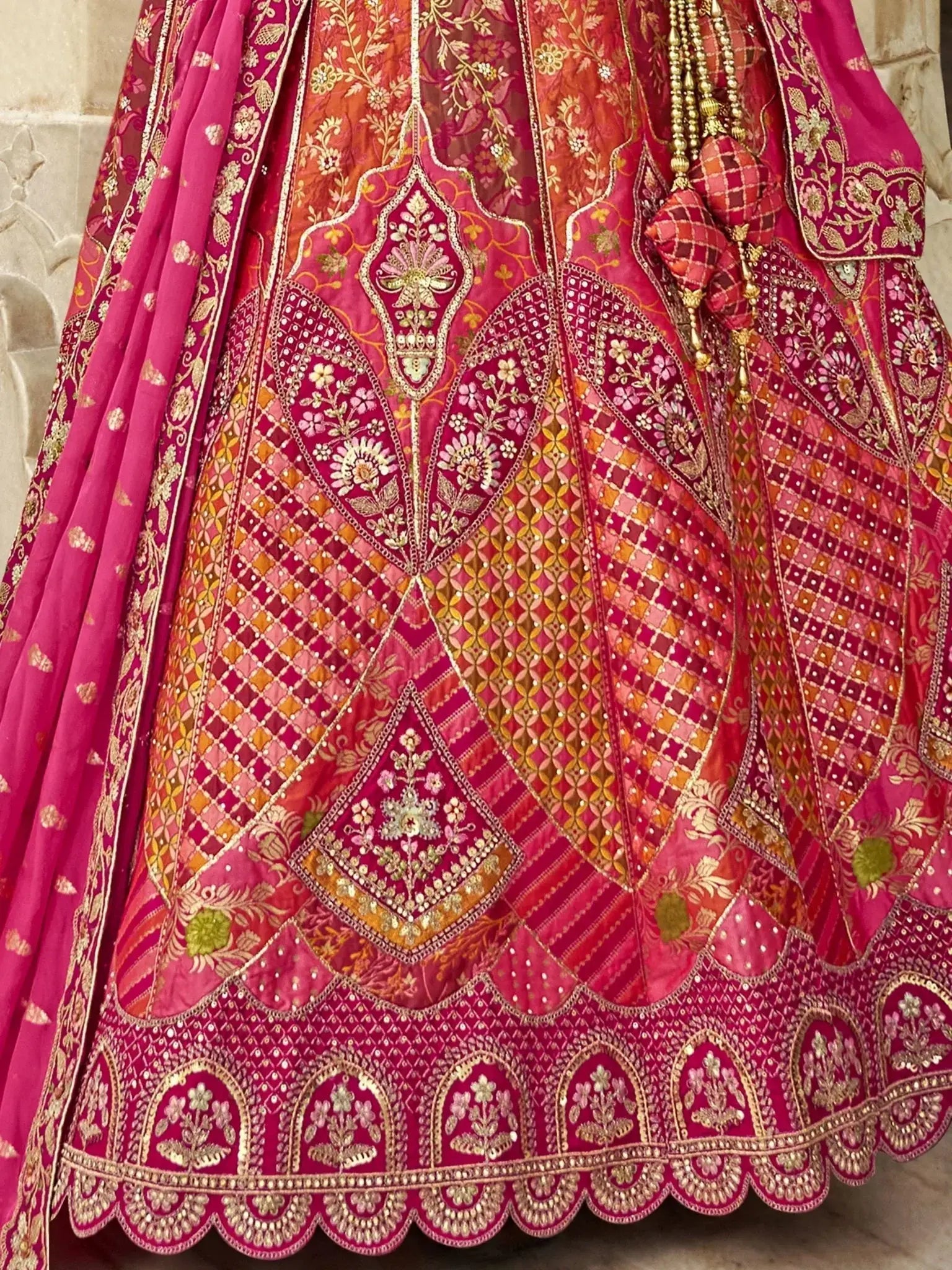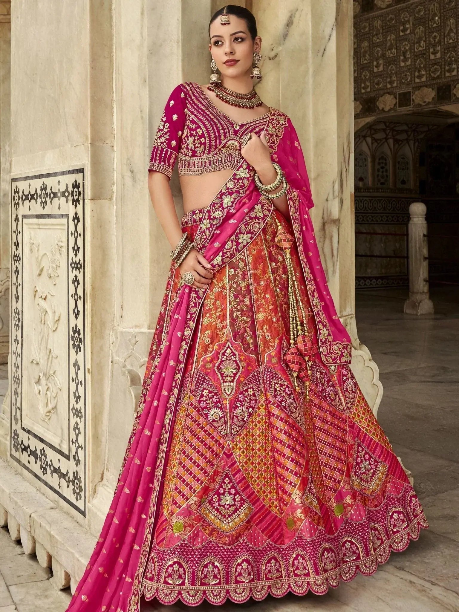 Complementing the lehenga is a rani pink blouse made of luxurious silk, adorned with heavy sequins and intricate jarkan embroidery. This opulent blouse, customizable up to 44 inches at the bust, adds a captivating contrast to the vibrant orange lehenga, making the entire outfit pop with color and detail. Together, they create a striking appearance that is sure to leave a lasting impression.