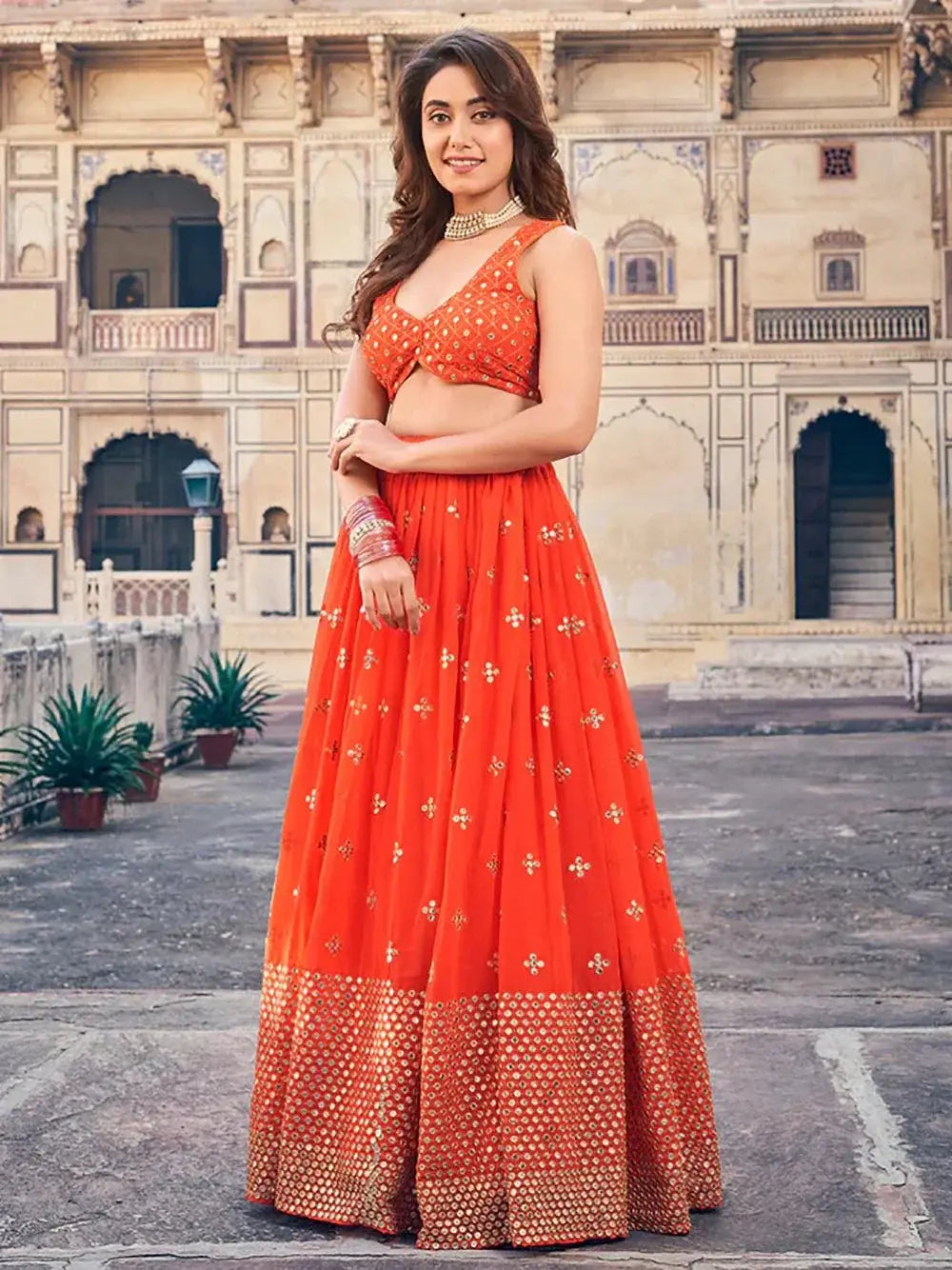 Radiate festive charm in this dazzling orange georgette lehenga, beautifully embellished with intricate sequins and zari work that adds a radiant glow to your ethnic wardrobe.