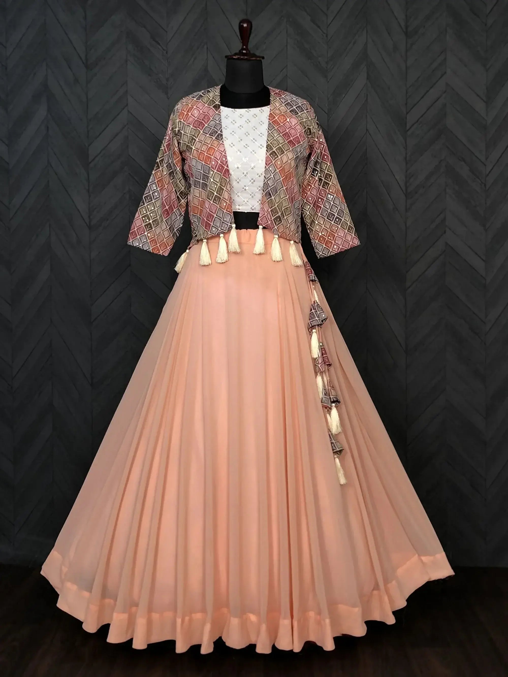 Accompanying the lehenga is a white color georgette crop top adorned with exquisite embroidered sequin work. The delicate detailing on the crop top adds a touch of glamour and allure, creating a stunning contrast against the peach hue of the lehenga. With its versatile design, the crop top complements the lehenga effortlessly, offering a modern twist to traditional attire.
