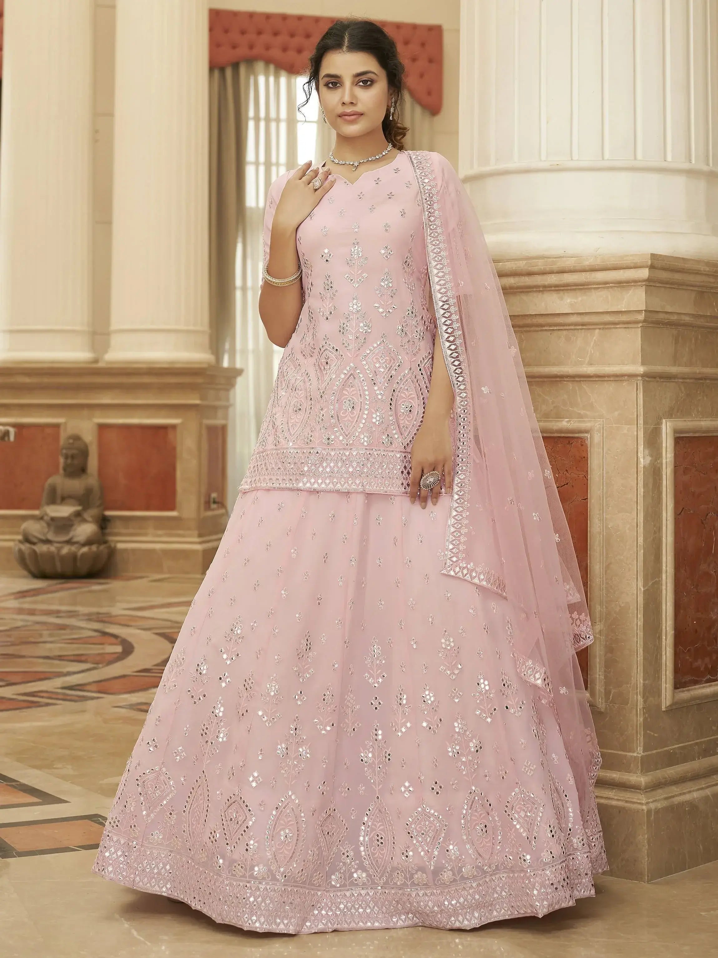 Add elegance and charm to your appearance by dressing in this gorgeous pink lehenga choli in georgette material embellished with all-over gotta patti, thread, and sequin embroidered work.