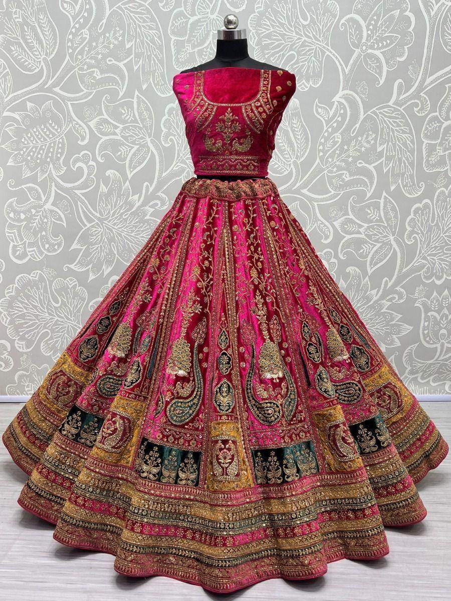 Make a grand appearance at your wedding with our pink bridal lehenga choli. This exquisite ensemble is designed to add a touch of elegance and sophistication to your special day. Crafted from heavy velvet fabric, the lehenga choli exudes luxury and opulence.