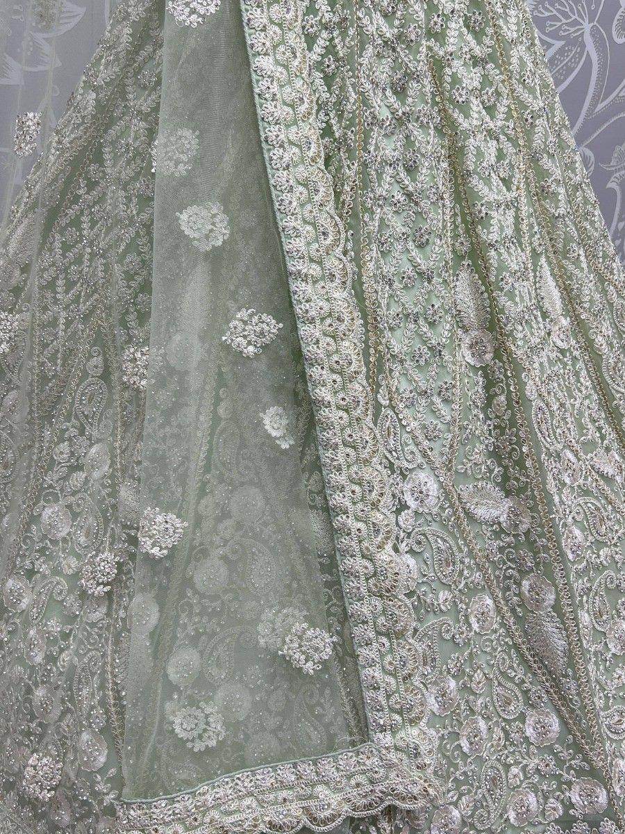 Introducing our beautiful pista green embroidered net reception wear lehenga choli, the epitome of elegance and style. This stunning ensemble is crafted with utmost precision using high-quality heavy net material that adds a touch of grace to your attire.