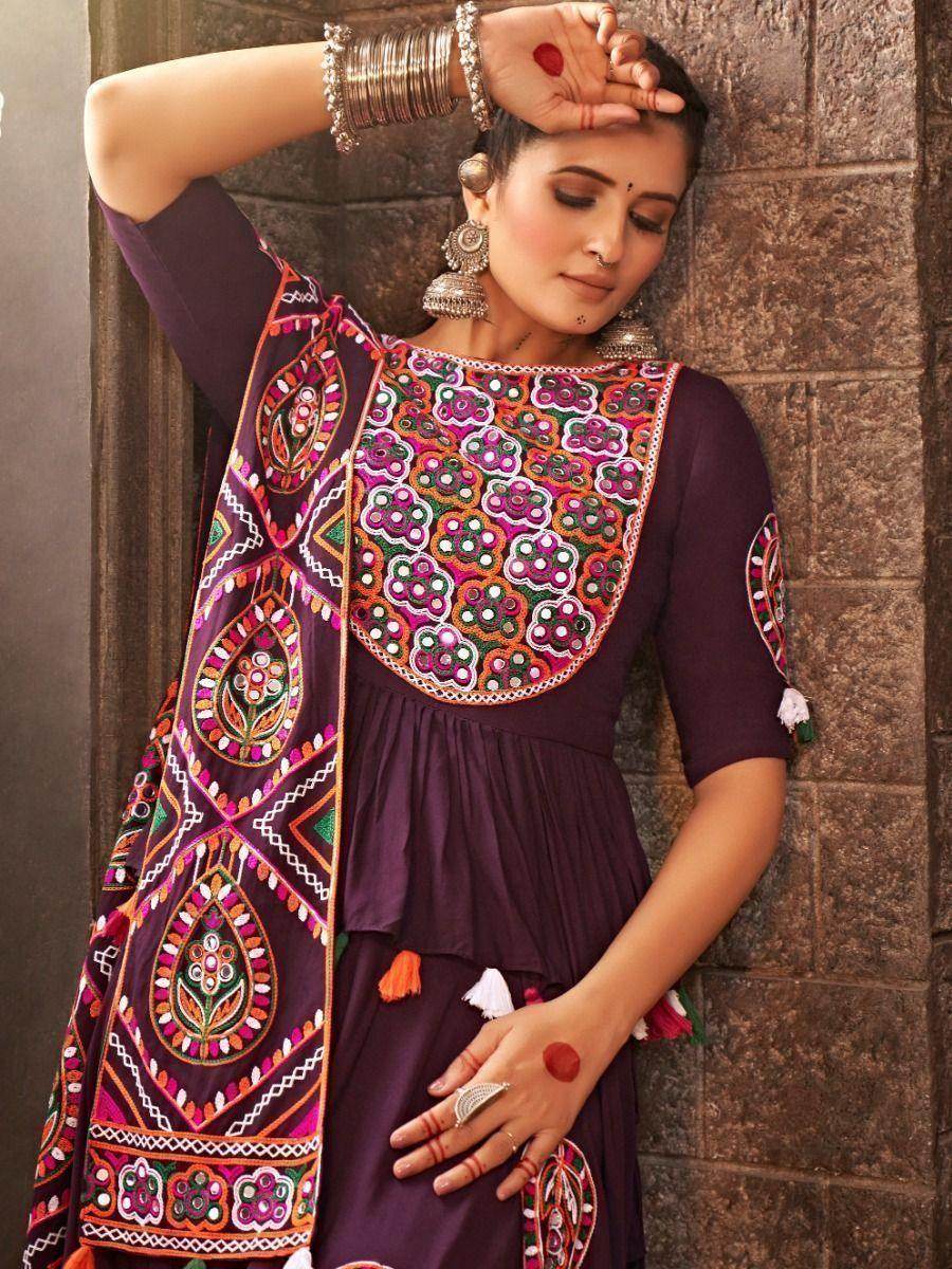 Adore this vibrant purple lehenga made from smooth viscose rayon, decorated with thread embroidery and mirror work. It's a true masterpiece that will captivate everyone's attention. The intricate embroidery and mirror work adds a touch of elegance and glamour to the outfit, making it perfect for special occasions and festivities.