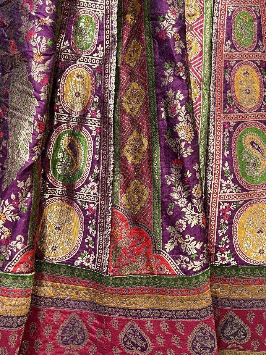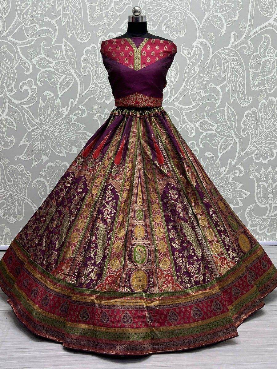 Introducing the beautiful purple weaving banarasi silk wedding lehenga choli, a stunning ensemble designed to make you look like a diva on your special day. Made from high-quality banarasi silk material, this lehenga features intricate zari weaving and meenakari handwork, showcasing the rich craftsmanship of Indian artisans.