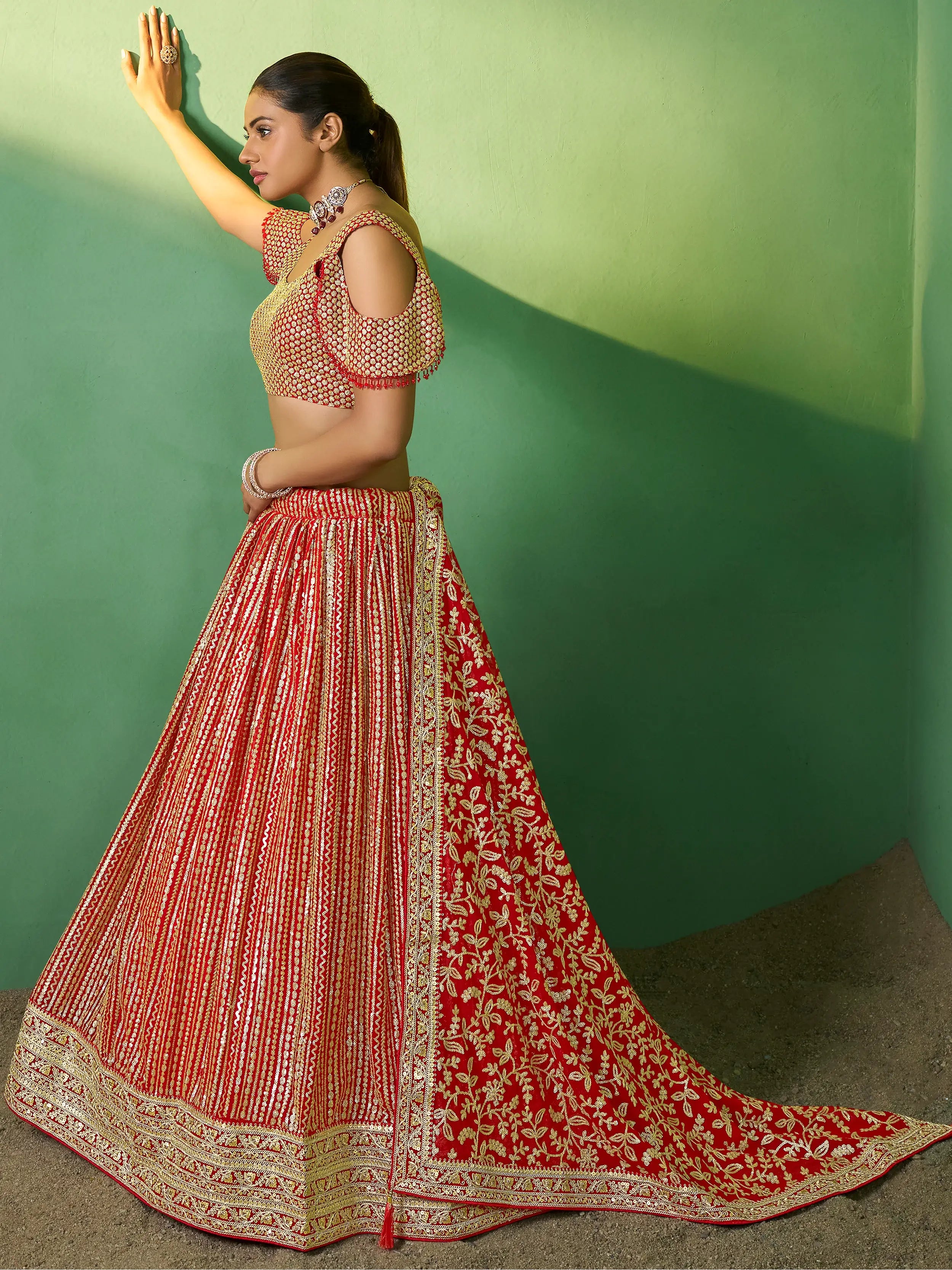 The beautiful red sequins georgette lehenga choli with net dupatta is a stunning piece of ethnic wear that will make you look and feel beautiful at any event. Its vibrant red color, sequin and embroidery work, and customizable fit make it a must-have addition to your wardrobe.