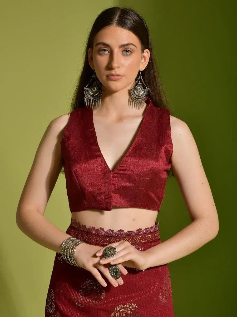 The rich and vibrant red color of the saree exudes femininity and grace, making you the center of attention wherever you go. The accompanying blouse material is unstitched, allowing you to customize it according to your style and preference. You can add your own unique touch to create a personalized look.
