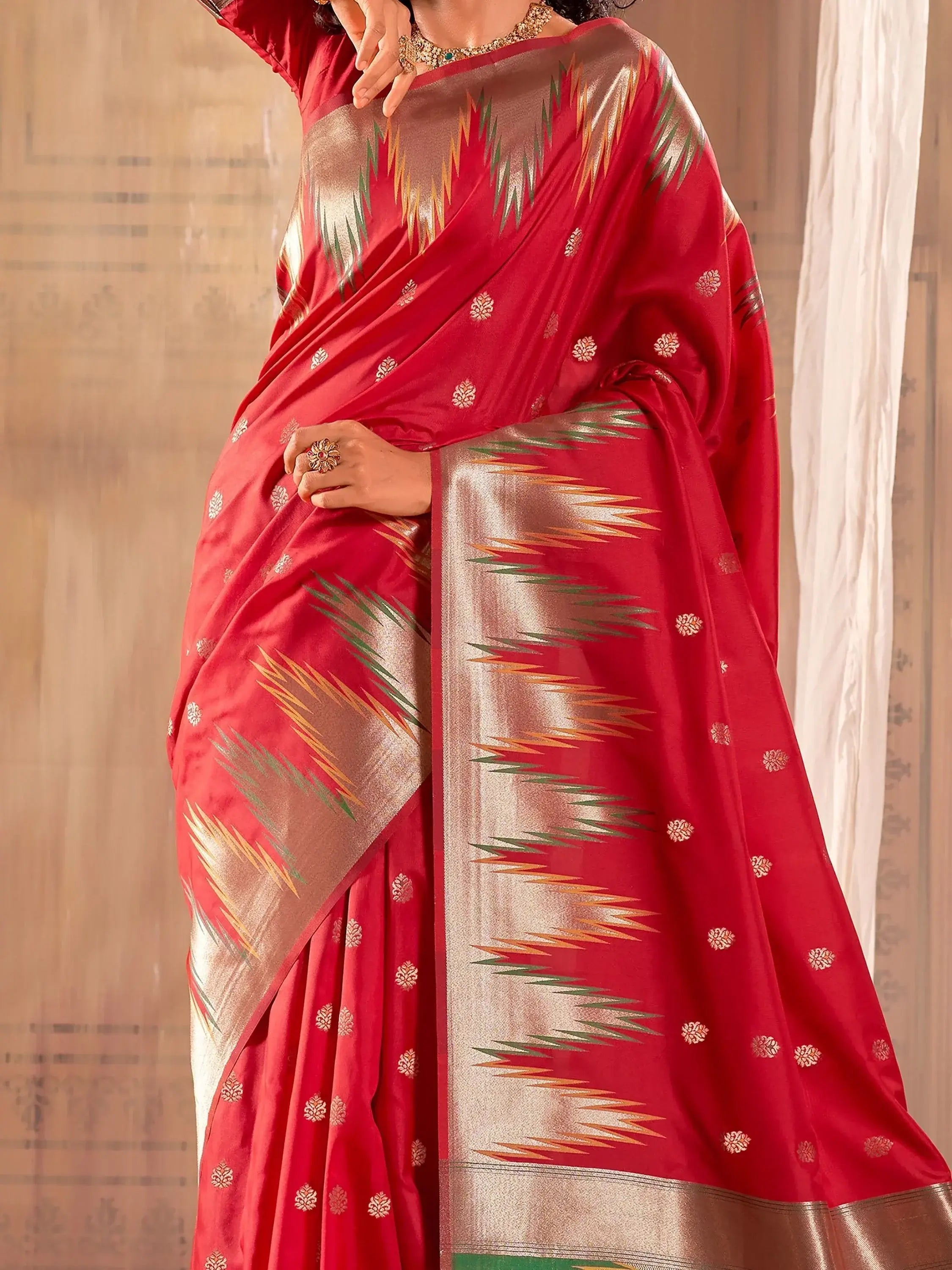 Minimalist in accessories, the red banarasi silk saree speaks volumes on its own, making a bold style statement with its vibrant color and intricate detailing. Whether paired with traditional jewelry for a classic look or contemporary accessories for a modern twist, this saree is versatile enough to suit any aesthetic.